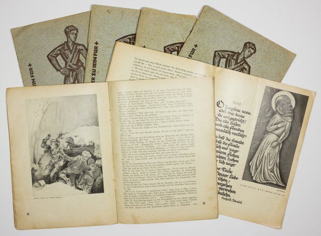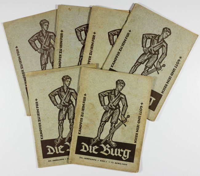 Collection of seven copies of the rare monthly publication "Die Burg", each about 30pp. 8vo., 1935-36, published by Verlag Herder, Freiburg. The motto of the publication is printed on the cover of every issue, beside a woodblock image of a young Teutonic soldier with a broad sword: "To be warriors for God to be enriched". Although a variety of articles appear within, many use religion, symbols of the cross, and even photographs and interviews with German clergymen to promote the goals of the Hitler Youth, and of course Nazism?despite the fact that the Nazis were most certainly an unreligious organization. Every issue has one article titled: "Youth in War" preparing these future Wehrmacht draftees for use at the front. The first column in each issue also reminds the young readers to never forget their "dead brothers", and names those Hitler Youth who had recently died. Really chilling indoctrination literature.