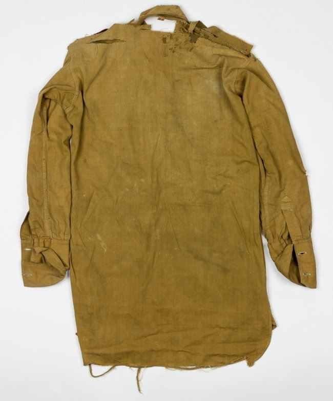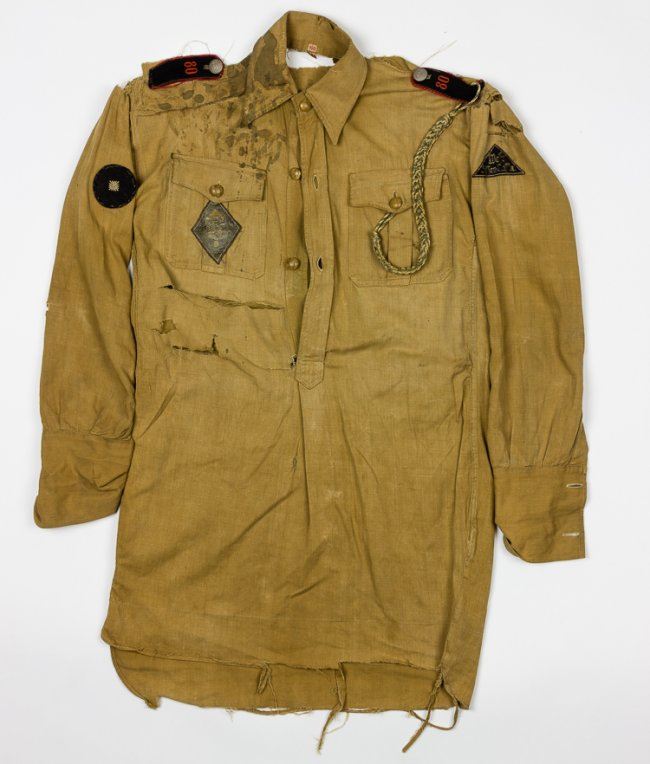 Badly damaged H.J. shirt sold only for its components which include black shoulder straps piped in red, embroidered "80" in red with buttons with the numeral "5"; officer's circular "pip" patch, green and white lanyard, "West Hessen-Nassau" sleeve triangle (worn), and a damaged achievement patch. As-is.