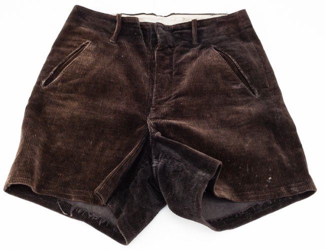 Excellent pair of H.J. shorts, brown corduroy, 30" waist, four-button fly will all original "H.J. D.J." buttons, which also appear on the two scalloped back pockets. Maker's label "Greiff" also present.