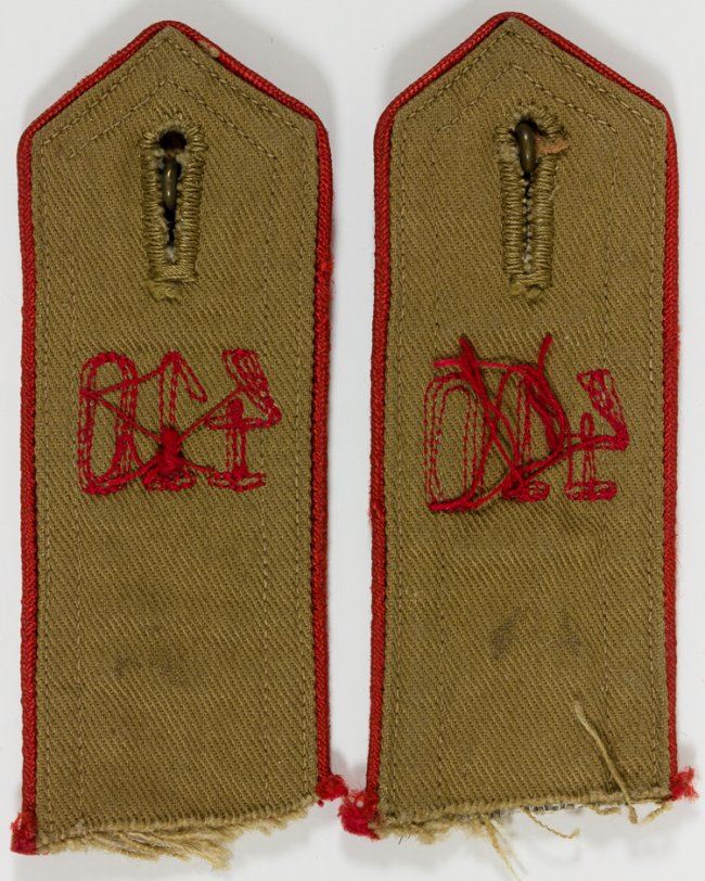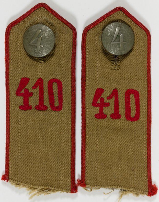 1933 pattern khaki shoulder straps cut from a H.J. uniform, embroidered ?410? in red with red piping, with buttons with raised numeral ?4?. $? x 1 ??, very good.