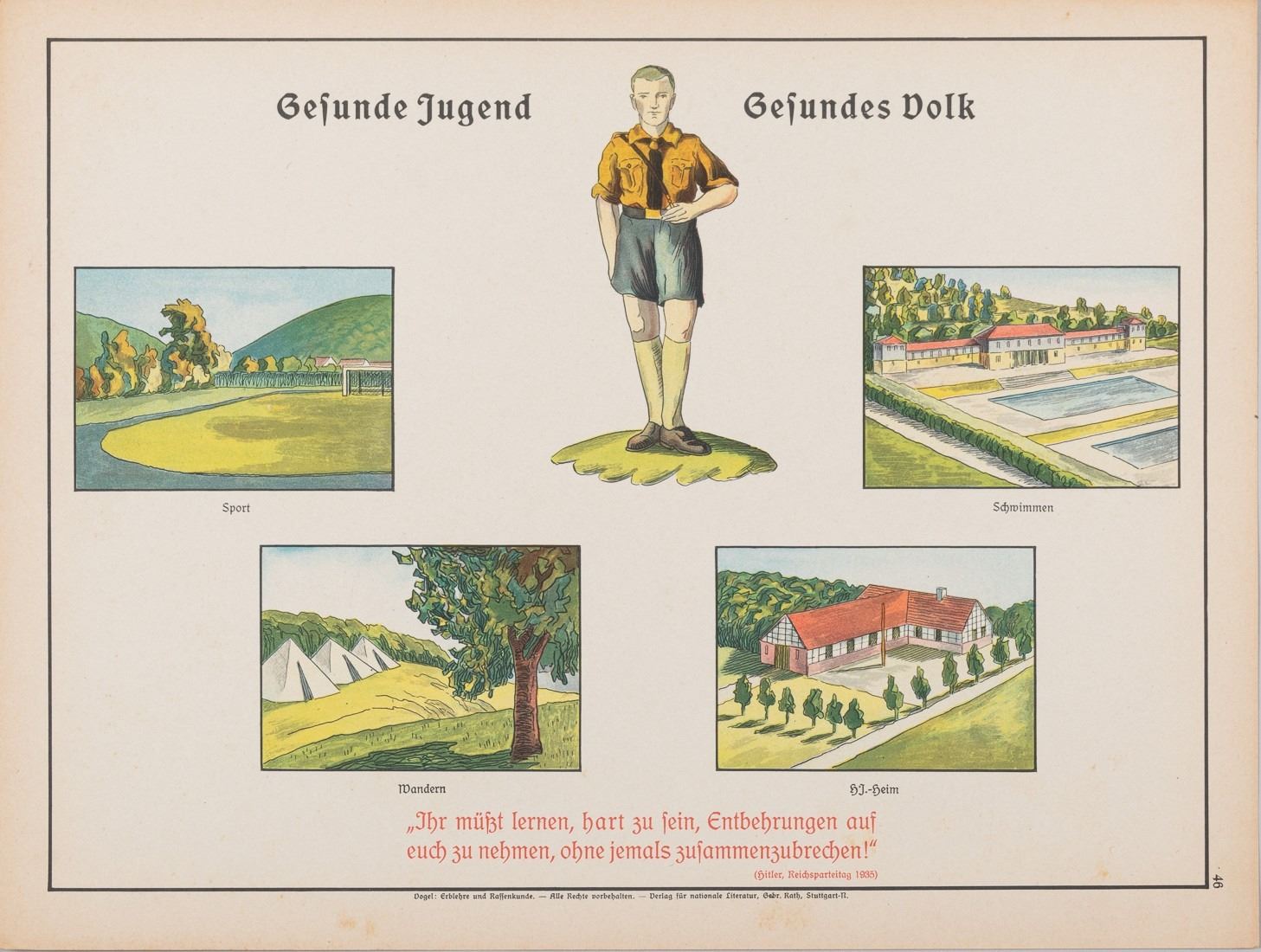 German teaching poster 'Healthy Youth - Healthy People' showing a Hitler Youth boy and healthy activities. Page 46 from Alfred Vogel's portfolio 'Heredity, Pedigree and Race Knowledge in Pictorial Representation' (Rassenkunde in bildlicher Darstellung). 11.5 x 15.5 inches, 1 page.