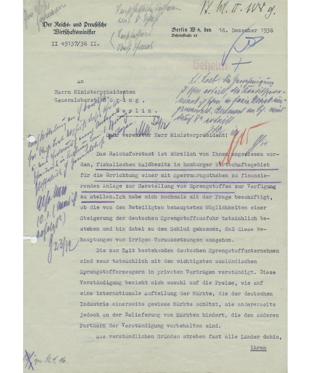 (1877 - 1970) German financier and banker who engineered the rearmament of Germany. Broke with Hitler and joined the resistance when Germany went to war. Aquitted at Nuremberg. T.L.S. as Minister of Economics on official letterhead, 3pp. large 4to., Berlin, Dec. 16, 1936 to HERMANN GOERING. A rather telling letter exposing the growth of Germany's arms industry, in part: "...The Reichs Forestry Department was recently ordered to provide forest property in Hamburg to erect a plant for the production of explosives...I ask myself is the increasing of German explosive exports really possible and are these based on insane expectations?..." He continues, explaining the contractual obligations make exports impossible, and that English and American competitors had a great advantage over similar industries in Germany. He concludes refusing to release funds to build the plant. File holes at left margin, else very good.