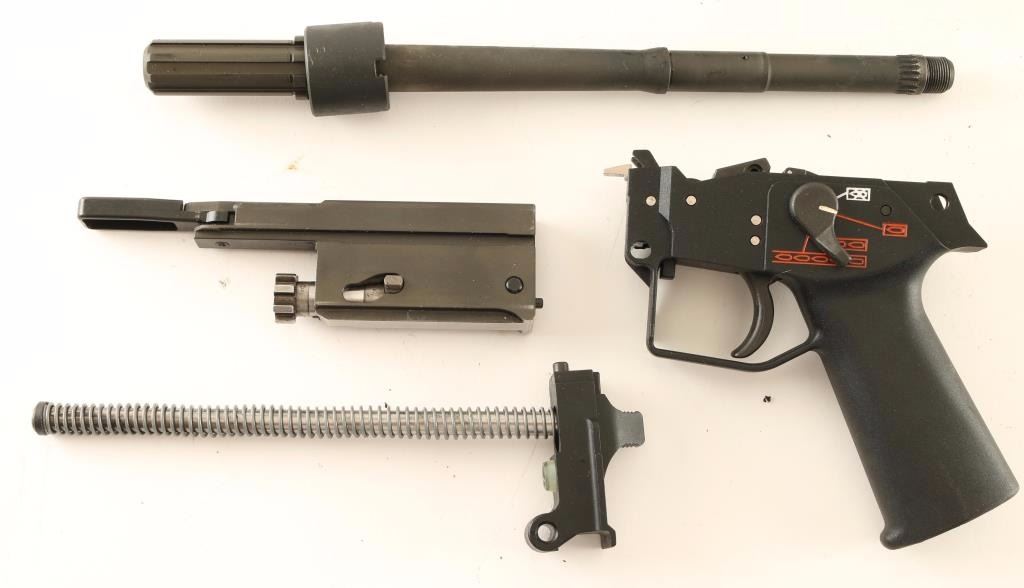 Includes a four position lower, full-auto bolt, 12.5" barrel, barrel nut, pronged muzzle break, gas block, recoil spring, mag well, cut receiver, forend, side folding stock, top rail with iron sights, pins & other small parts. Condition is very good.