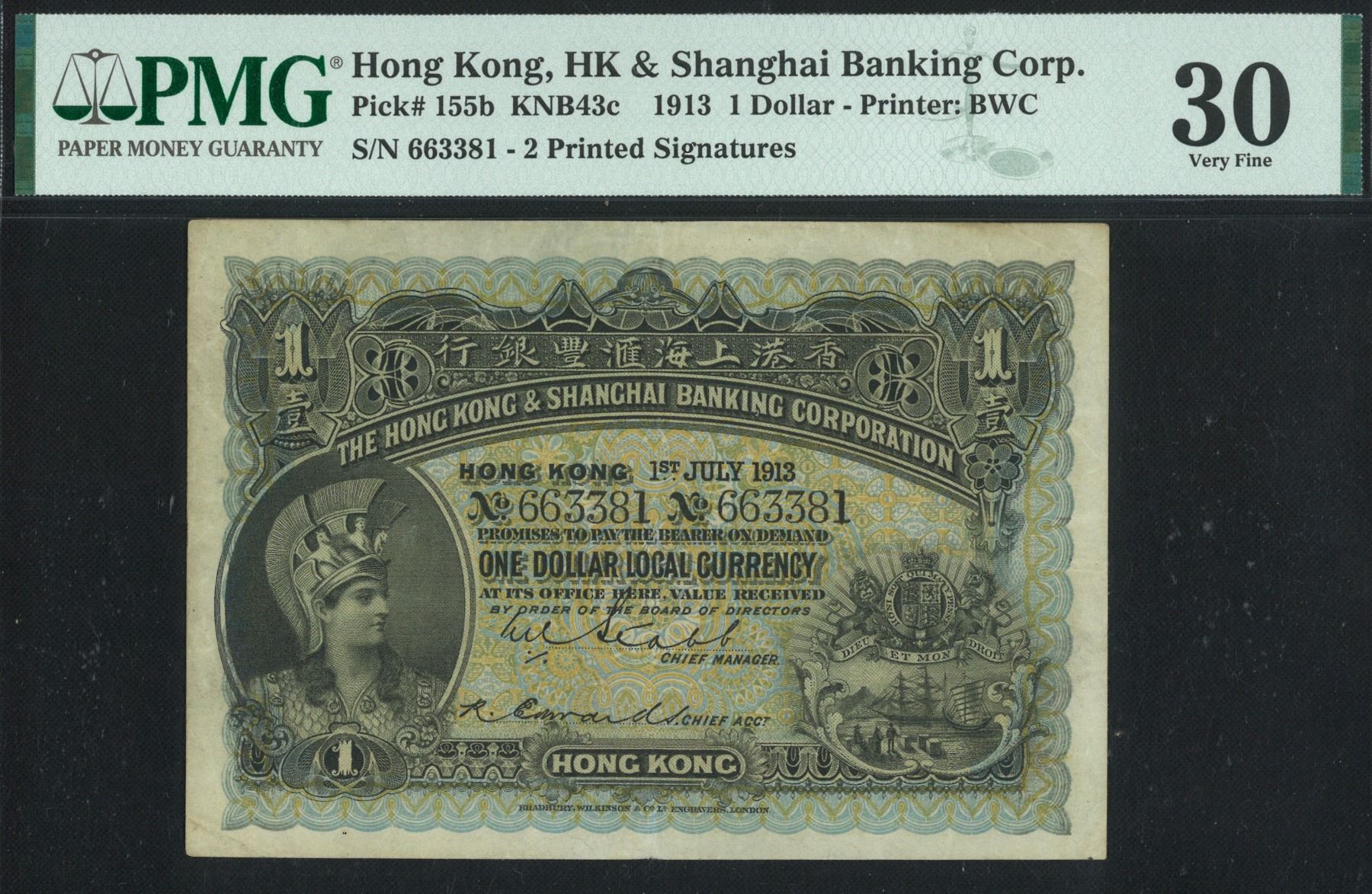 1913, 香港上海匯豐銀行, $1, 編號: 663381, PMG 30。褪色。