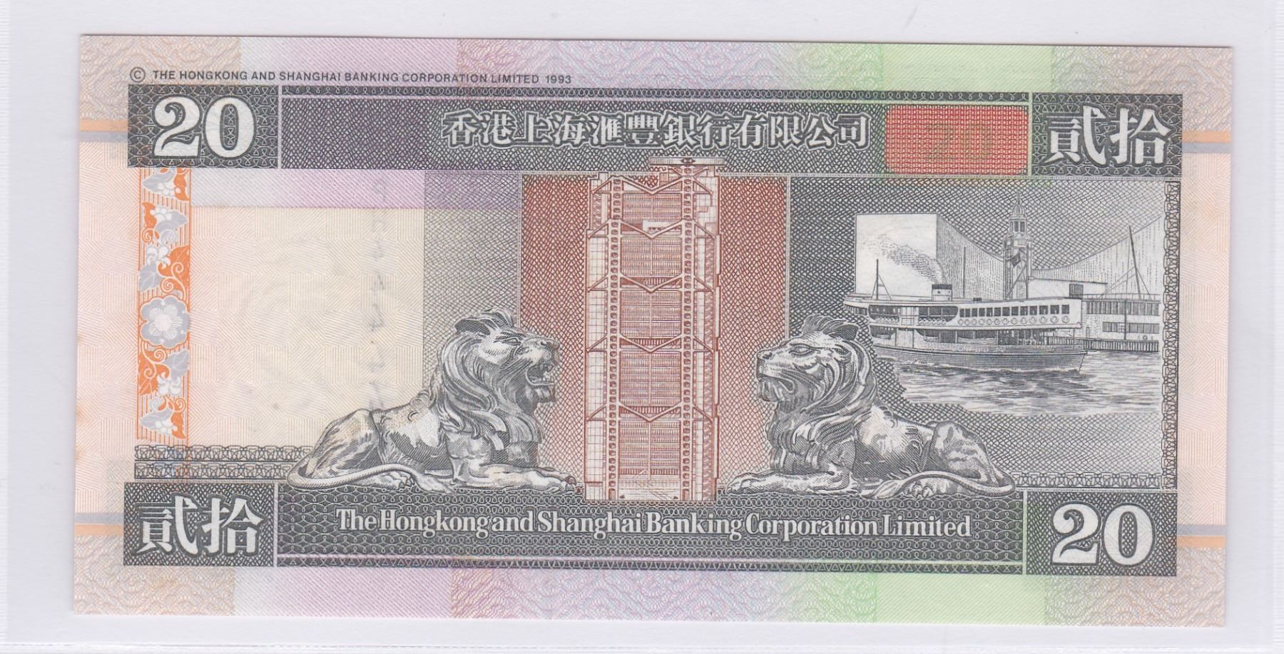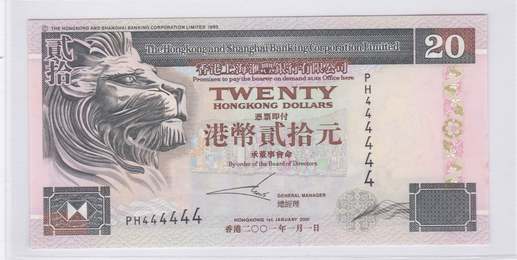 HK & Shanghai Banking Corp., 2001, $20, PH444444. UNC condition. Solid# 4