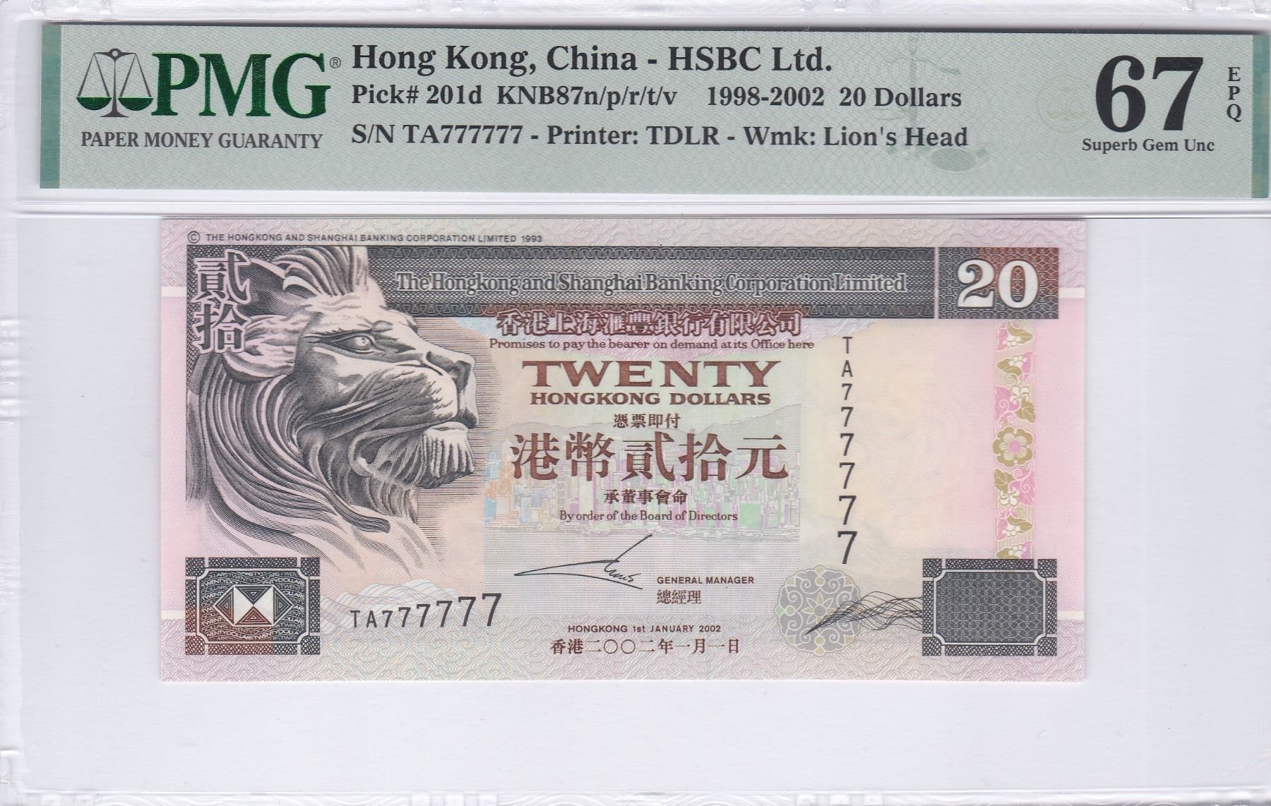 2002, 匯豐銀行, $20, 編號: TA777777. PMG 67EPQ. 幸運號全7