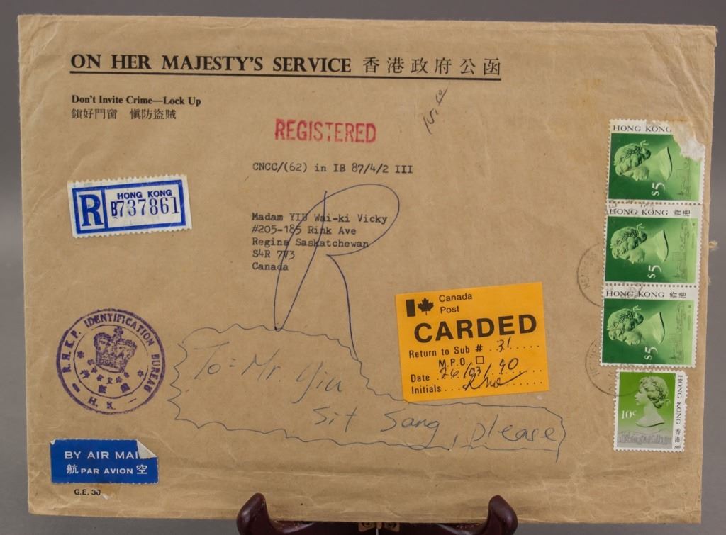 Envelope with stamps. Sent from Hong Kong to Canada. Air Mail sticker to the bottom left corner. Accompanied with a number of post office seals. 17 x 23 cm.