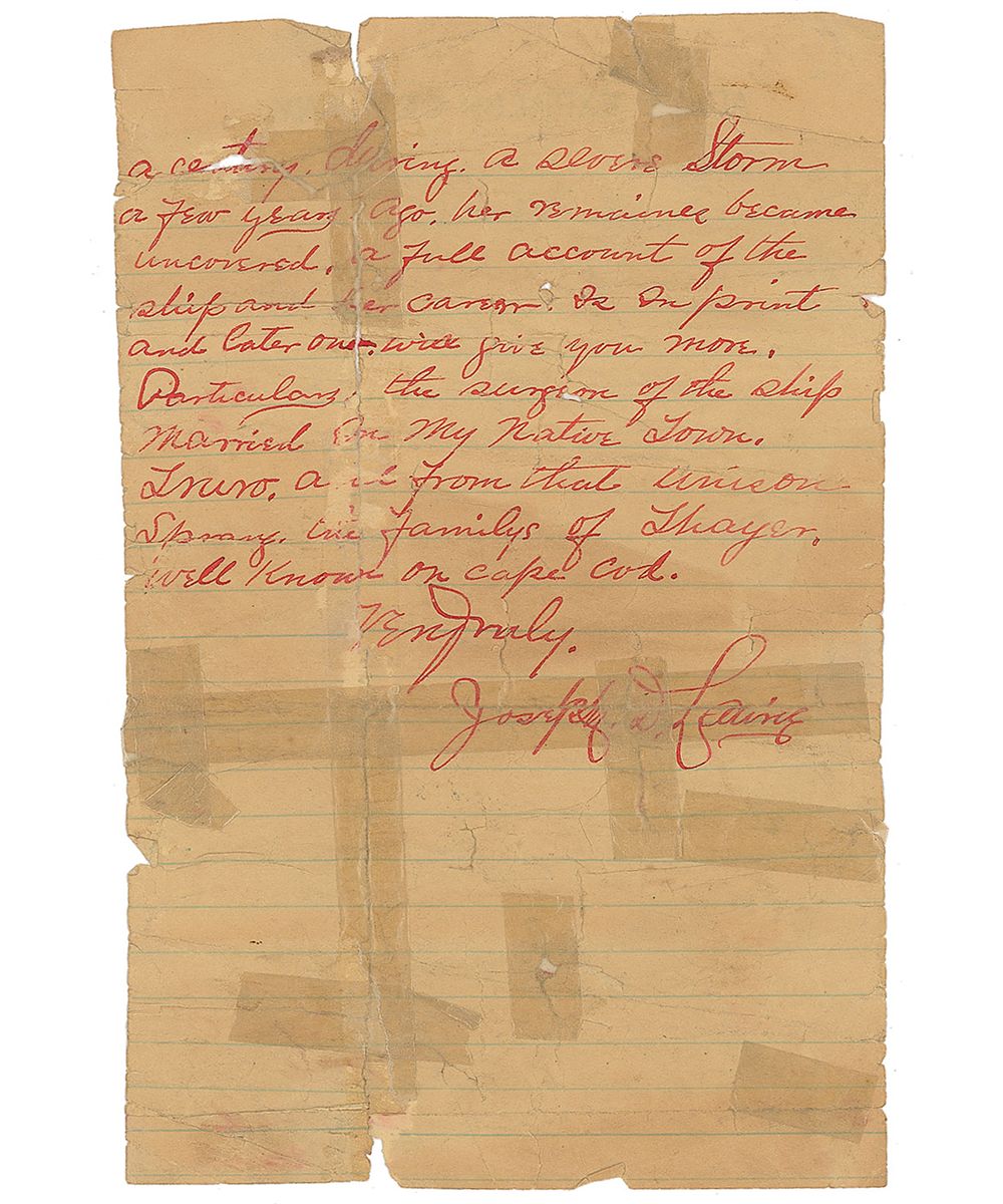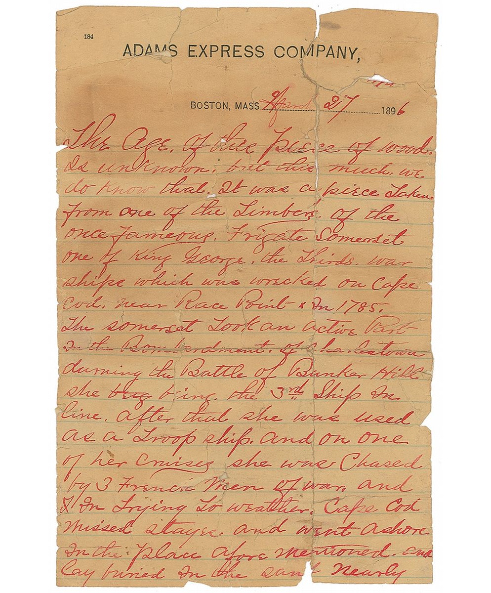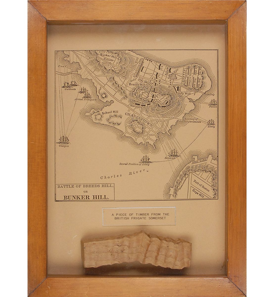 Fragment of wood from the HMS Somerset, measuring 5 x 1.25 x 1, nicely mounted against a map showing the position of British ships during the Battle of Bunker Hill on June 17, 1775, and framed in a shadowbox to an overall size of 9.5 x 13 x 2. Includes a well-worn letter of provenance on Adams Express Company letterhead, one page both sides, Boston, March 27, 1896, in full: “The age of the piece of wood is unknown, but this much we do know, that it was a piece taken from one of the timbers of the once fameous Frigate Somerset, one of King George, the Thirds war ships which was wrecked on Cape Cod near Race Point in 1785. The Somerset took an active part in the bombardment of Charlestown during the Battle of Bunker Hill, she being the 3rd ship in line. After that she was used as a troop ship and on one of her cruises she was chased by 3 French men of war and in trying to weather Cape Cod missed stayes and went ashore in the place afore mentioned and lay buried in the sand nearly a century. During a severe storm a few years ago her remains became uncovered. A full account of the ship and her career is in print and later one will give you more particulars. The surgeon of the ship married in my native town Truro, and from that union sprang the familys of Thayer well known on Cape Cod.”
