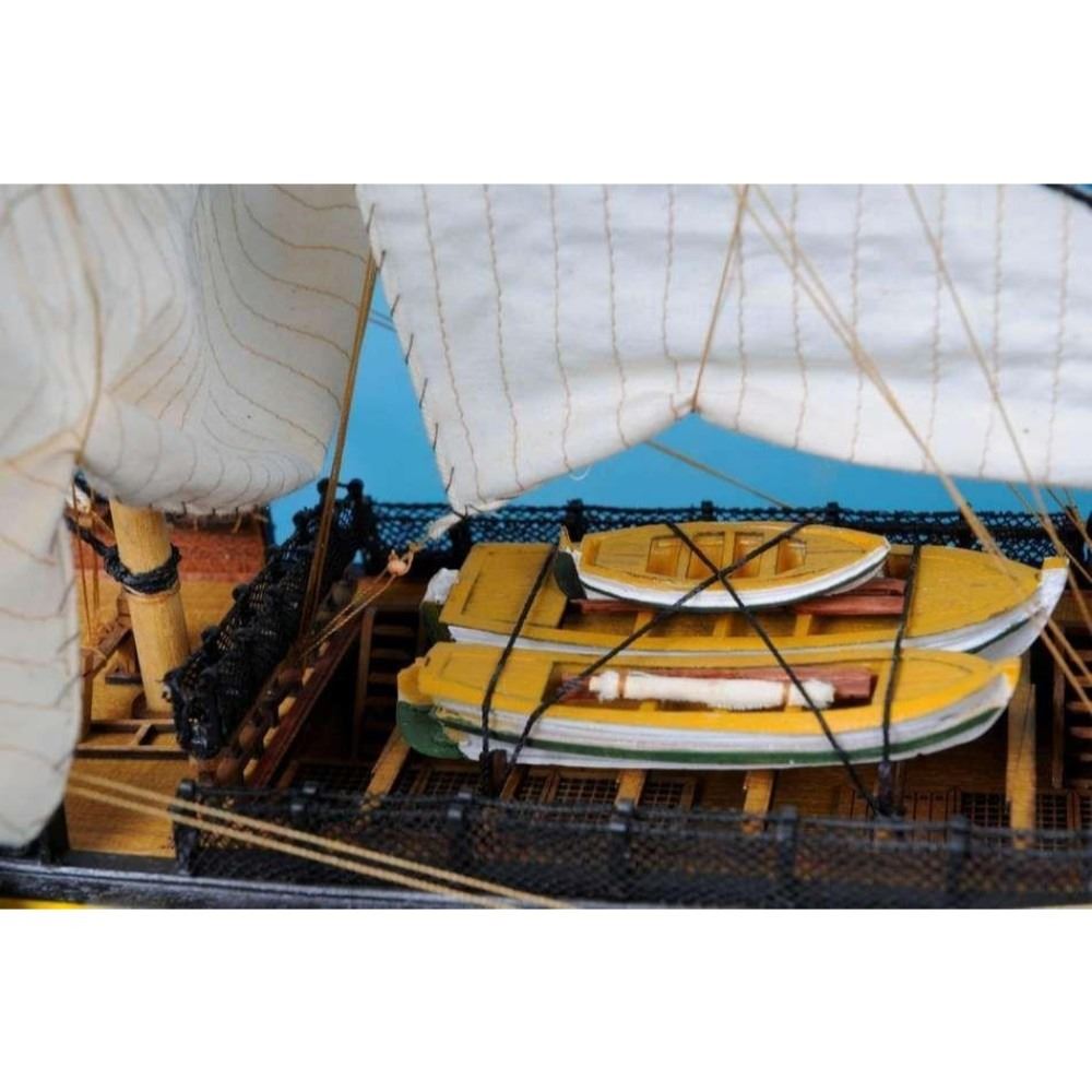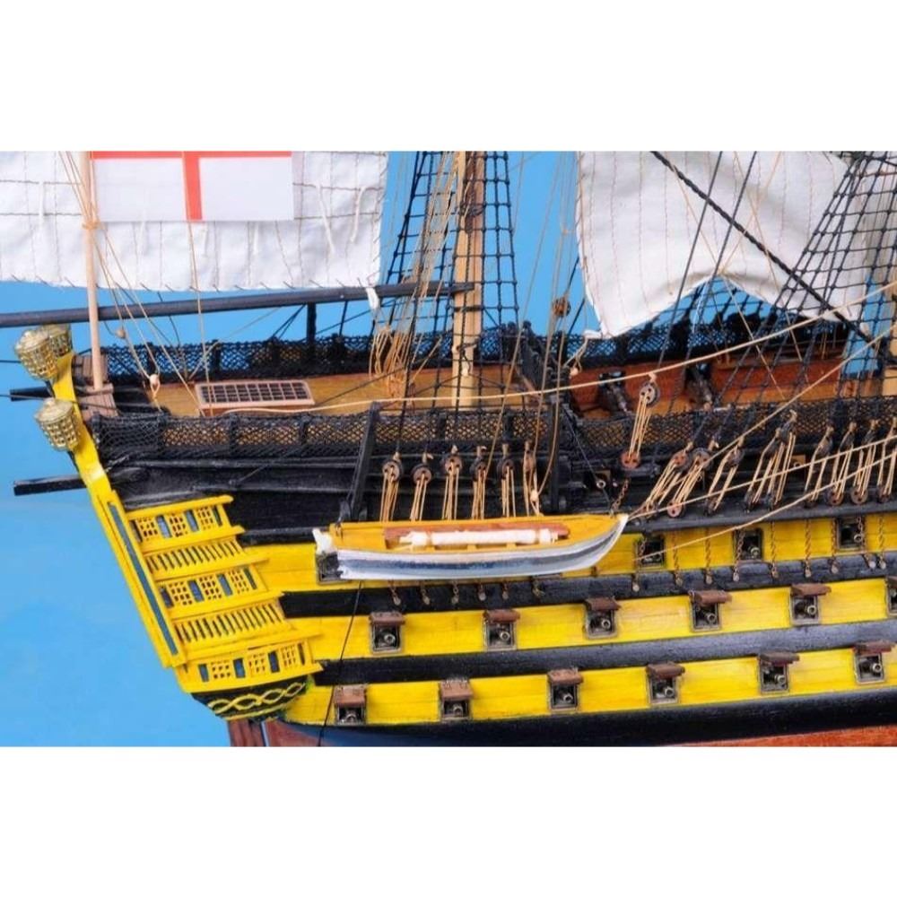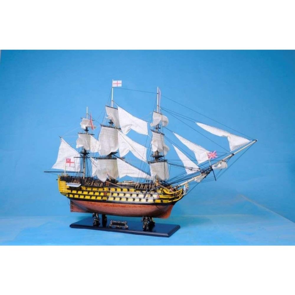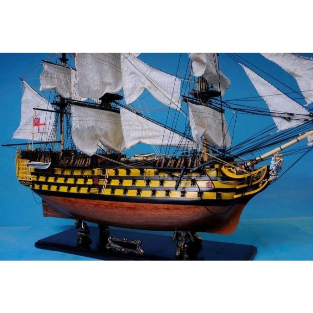 HMS Victory 50" Limited SOLD FULLY ASSEMBLED Ready for Immediate Display - Not a Model Ship kit Truly capturing the pride and magnificence of Admiral Nelson’s flagship at the Battle of Trafalgar, this Limited Edition scale replica model tall ship sails proudly as the indomitable flagship of the HMS Victory fleet. Brimming with museum-quality features, this tall ships model of the world’s oldest commissioned warship evokes the spirit of her namesake through devoted attention to historical accuracy and the finest of craftsmanship. A commanding centerpiece for any boardroom, office or den, HMS Victory will inspire a victorious determination with her historic patriotism and awe with her exquisite design. 50" Long x 15" Wide x 34" High (1:55 scale) Built from scratch over hundreds of hours by master artisans High quality woods include cherry, birch, maple and rosewood Individual wooden planks used in hull construction Museum Quality features not available in other model tall ships under $5,000 or any kit Increased detail of deck features, cannon carriages, painting and other features Largest size replica model tall ships allows maximum detailing of features, including: Additional deck items Highly complex rigging Increased scale accuracy Many other quality enhancements Most complex rigging of any model tall ships with hundreds of blocks and deadeyes Other Amazing Details, including: Intricately carved hand-painted figurehead, scrollwork and stern window panes Planked deck with nail holes Authentic scale lifeboats with oars Lattice grates, rudder chains, wooden ladders and planked steps Gun-deck and cannon visible through open main-deck grate Solid brass cannons and metal anchors Masterfully stitched, heavy canvas sails hold shape and do not wrinkle Taut rigging with varied thread gauge and color Limited production run only 10 of these model tall ships Certificate of Authenticity individually numbered and signed by HMS Founder and Master Builder Richard Norris Wooden display base features four arched dolphins Pictured with marble base (available for purchase) Extensive research of original plans, historical drawings and paintings as well as actual photographs ensures the highest possible accuracy