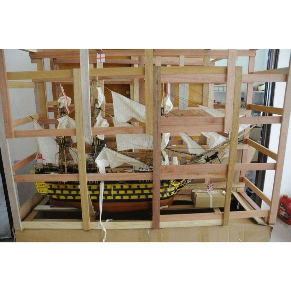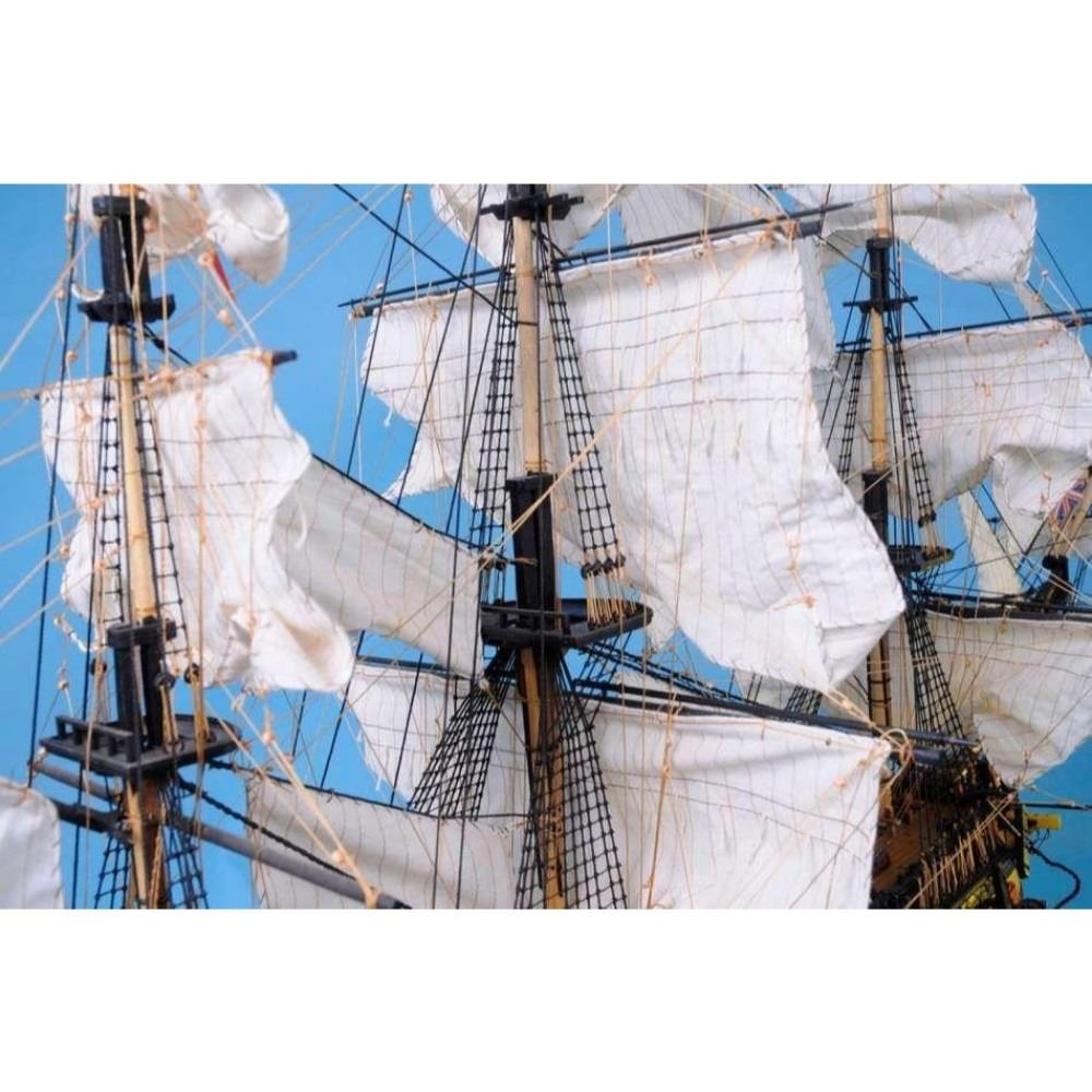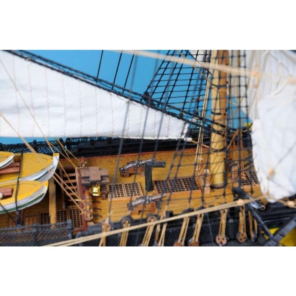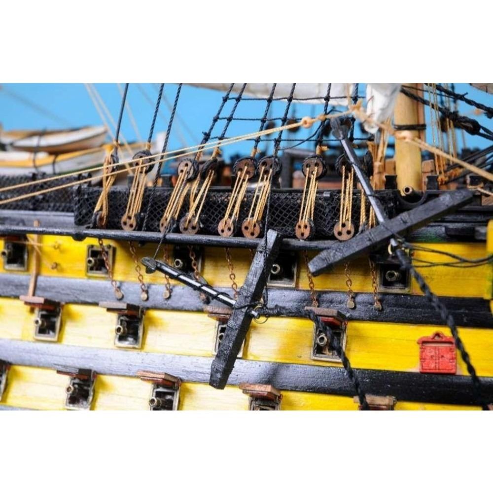 HMS Victory 50" Limited SOLD FULLY ASSEMBLED Ready for Immediate Display - Not a Model Ship kit Truly capturing the pride and magnificence of Admiral Nelson’s flagship at the Battle of Trafalgar, this Limited Edition scale replica model tall ship sails proudly as the indomitable flagship of the HMS Victory fleet. Brimming with museum-quality features, this tall ships model of the world’s oldest commissioned warship evokes the spirit of her namesake through devoted attention to historical accuracy and the finest of craftsmanship. A commanding centerpiece for any boardroom, office or den, HMS Victory will inspire a victorious determination with her historic patriotism and awe with her exquisite design. 50" Long x 15" Wide x 34" High (1:55 scale) Built from scratch over hundreds of hours by master artisans High quality woods include cherry, birch, maple and rosewood Individual wooden planks used in hull construction Museum Quality features not available in other model tall ships under $5,000 or any kit Increased detail of deck features, cannon carriages, painting and other features Largest size replica model tall ships allows maximum detailing of features, including: Additional deck items Highly complex rigging Increased scale accuracy Many other quality enhancements Most complex rigging of any model tall ships with hundreds of blocks and deadeyes Other Amazing Details, including: Intricately carved hand-painted figurehead, scrollwork and stern window panes Planked deck with nail holes Authentic scale lifeboats with oars Lattice grates, rudder chains, wooden ladders and planked steps Gun-deck and cannon visible through open main-deck grate Solid brass cannons and metal anchors Masterfully stitched, heavy canvas sails hold shape and do not wrinkle Taut rigging with varied thread gauge and color Limited production run only 10 of these model tall ships Certificate of Authenticity individually numbered and signed by HMS Founder and Master Builder Richard Norris Wooden display base features four arched dolphins Pictured with marble base (available for purchase) Extensive research of original plans, historical drawings and paintings as well as actual photographs ensures the highest possible accuracy