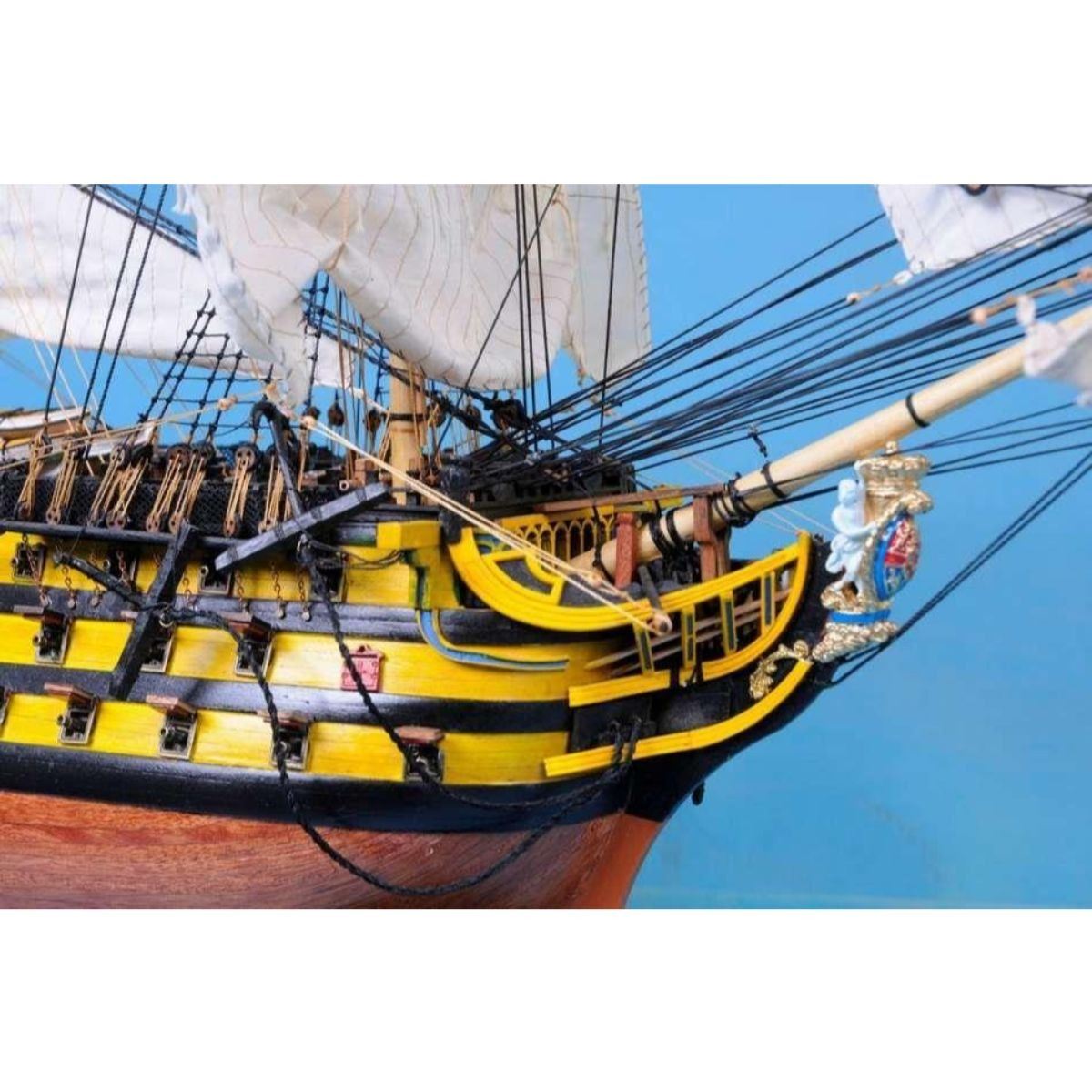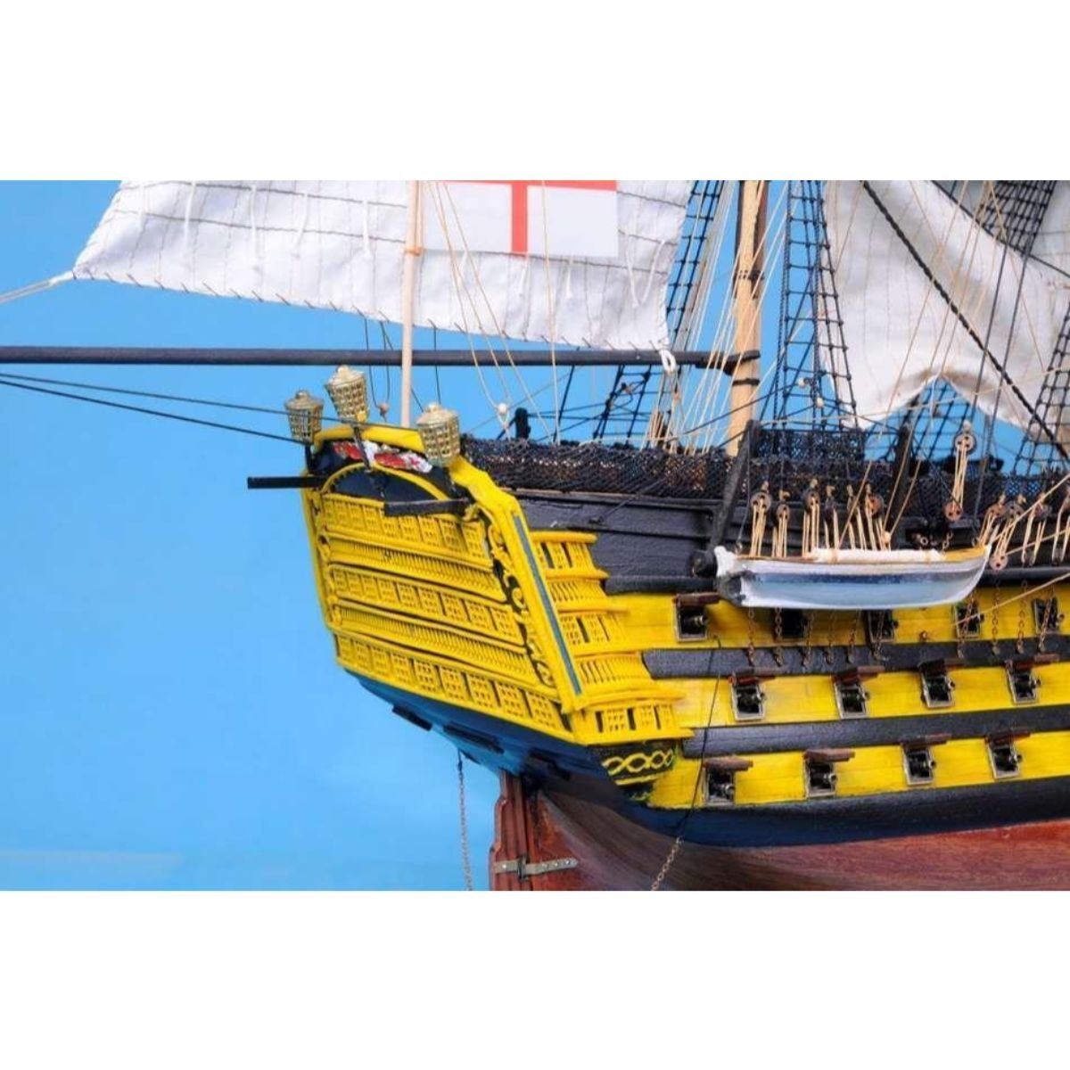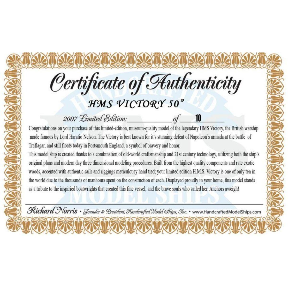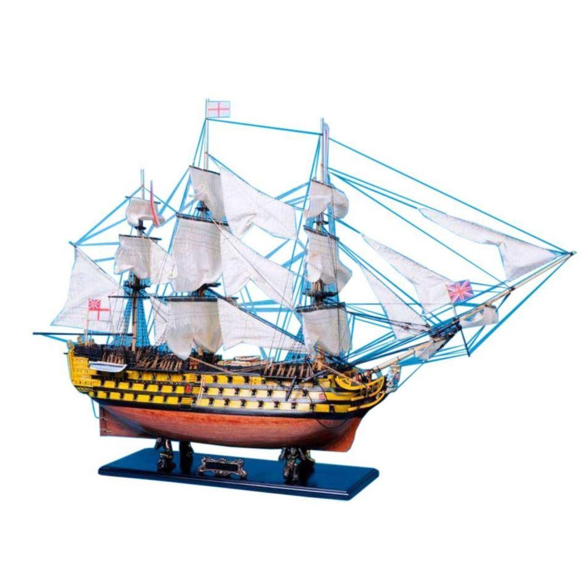 HMS Victory 50" Limited SOLD FULLY ASSEMBLED Ready for Immediate Display - Not a Model Ship kit Truly capturing the pride and magnificence of Admiral Nelson’s flagship at the Battle of Trafalgar, this Limited Edition scale replica model tall ship sails proudly as the indomitable flagship of the HMS Victory fleet. Brimming with museum-quality features, this tall ships model of the world’s oldest commissioned warship evokes the spirit of her namesake through devoted attention to historical accuracy and the finest of craftsmanship. A commanding centerpiece for any boardroom, office or den, HMS Victory will inspire a victorious determination with her historic patriotism and awe with her exquisite design. 50" Long x 15" Wide x 34" High (1:55 scale) Built from scratch over hundreds of hours by master artisans High quality woods include cherry, birch, maple and rosewood Individual wooden planks used in hull construction Museum Quality features not available in other model tall ships under $5,000 or any kit Increased detail of deck features, cannon carriages, painting and other features Largest size replica model tall ships allows maximum detailing of features, including: Additional deck items Highly complex rigging Increased scale accuracy Many other quality enhancements Most complex rigging of any model tall ships with hundreds of blocks and deadeyes Other Amazing Details, including: Intricately carved hand-painted figurehead, scrollwork and stern window panes Planked deck with nail holes Authentic scale lifeboats with oars Lattice grates, rudder chains, wooden ladders and planked steps Gun-deck and cannon visible through open main-deck grate Solid brass cannons and metal anchors Masterfully stitched, heavy canvas sails hold shape and do not wrinkle Taut rigging with varied thread gauge and color Limited production run only 10 of these model tall ships Certificate of Authenticity individually numbered and signed by HMS Founder and Master Builder Richard Norris Wooden display base features four arched dolphins Pictured with marble base (available for purchase) Extensive research of original plans, historical drawings and paintings as well as actual photographs ensures the highest possible accuracy
