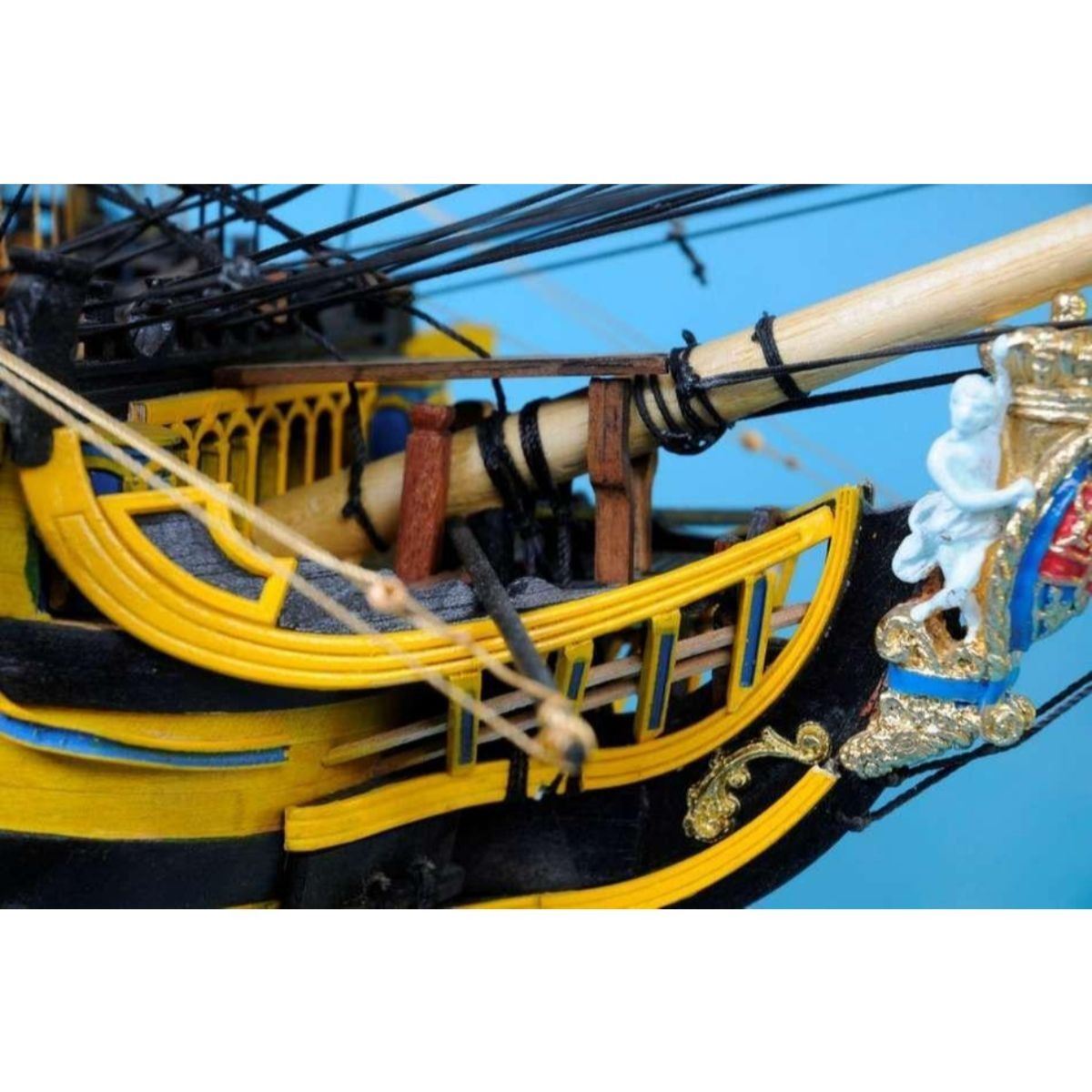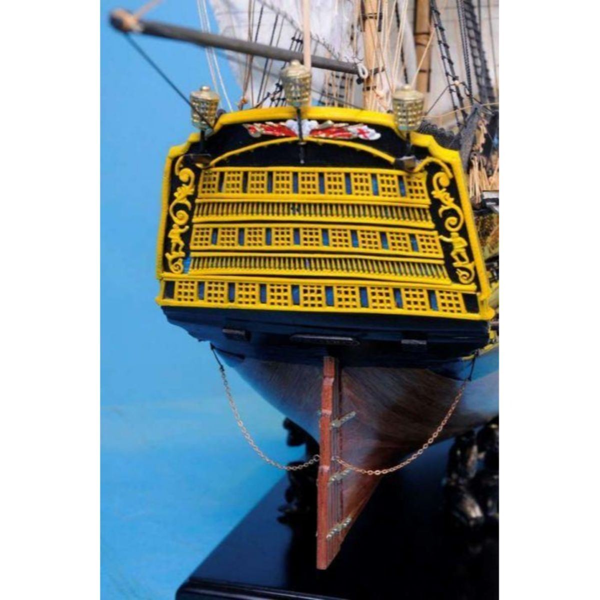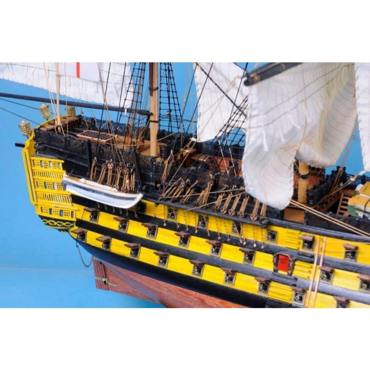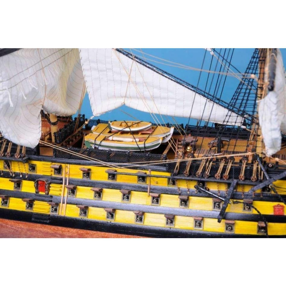 HMS Victory 50" Limited SOLD FULLY ASSEMBLED Ready for Immediate Display - Not a Model Ship kit Truly capturing the pride and magnificence of Admiral Nelson’s flagship at the Battle of Trafalgar, this Limited Edition scale replica model tall ship sails proudly as the indomitable flagship of the HMS Victory fleet. Brimming with museum-quality features, this tall ships model of the world’s oldest commissioned warship evokes the spirit of her namesake through devoted attention to historical accuracy and the finest of craftsmanship. A commanding centerpiece for any boardroom, office or den, HMS Victory will inspire a victorious determination with her historic patriotism and awe with her exquisite design. 50" Long x 15" Wide x 34" High (1:55 scale) Built from scratch over hundreds of hours by master artisans High quality woods include cherry, birch, maple and rosewood Individual wooden planks used in hull construction Museum Quality features not available in other model tall ships under $5,000 or any kit Increased detail of deck features, cannon carriages, painting and other features Largest size replica model tall ships allows maximum detailing of features, including: Additional deck items Highly complex rigging Increased scale accuracy Many other quality enhancements Most complex rigging of any model tall ships with hundreds of blocks and deadeyes Other Amazing Details, including: Intricately carved hand-painted figurehead, scrollwork and stern window panes Planked deck with nail holes Authentic scale lifeboats with oars Lattice grates, rudder chains, wooden ladders and planked steps Gun-deck and cannon visible through open main-deck grate Solid brass cannons and metal anchors Masterfully stitched, heavy canvas sails hold shape and do not wrinkle Taut rigging with varied thread gauge and color Limited production run only 10 of these model tall ships Certificate of Authenticity individually numbered and signed by HMS Founder and Master Builder Richard Norris Wooden display base features four arched dolphins Pictured with marble base (available for purchase) Extensive research of original plans, historical drawings and paintings as well as actual photographs ensures the highest possible accuracy