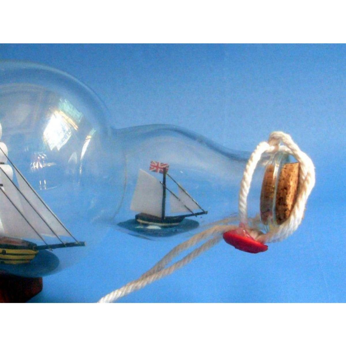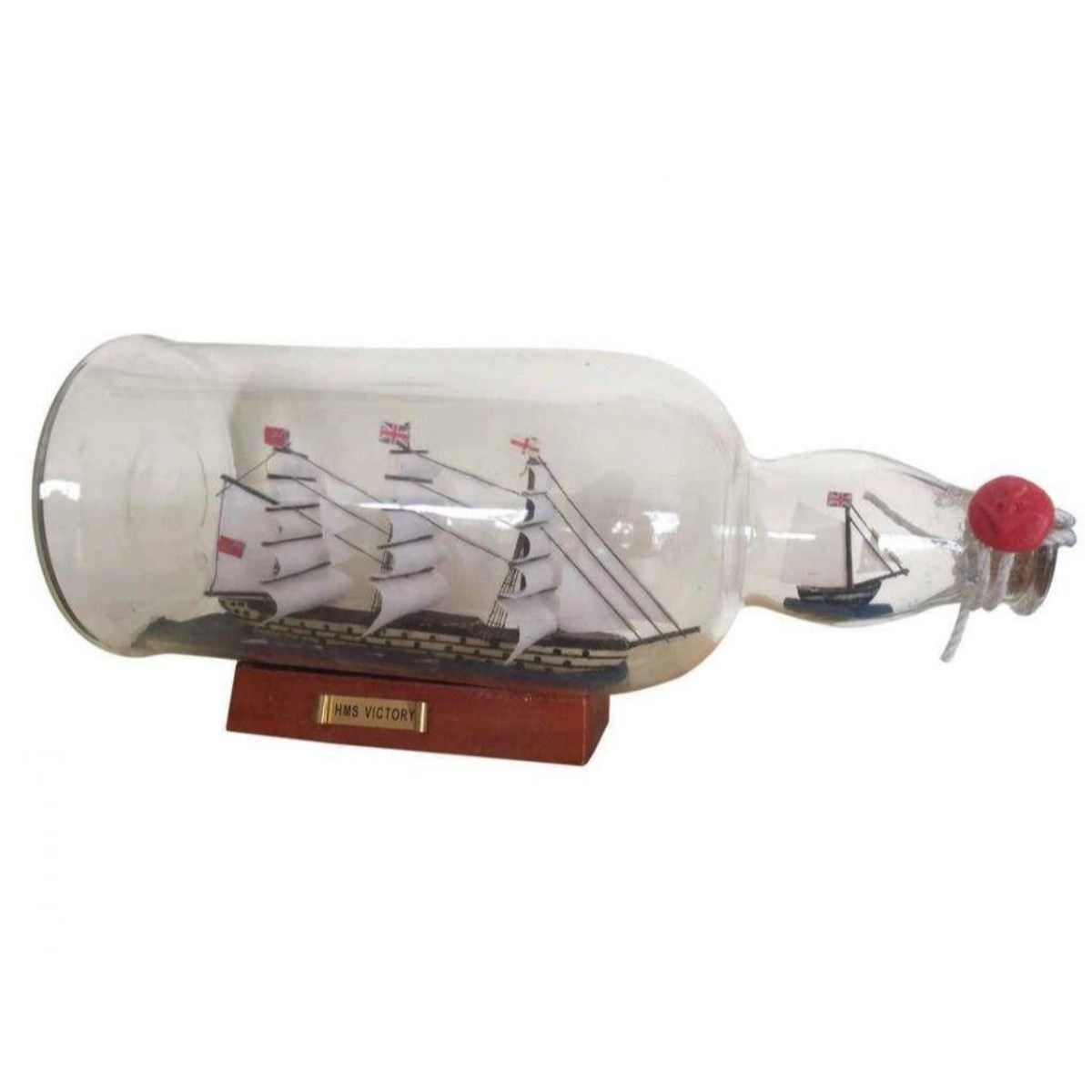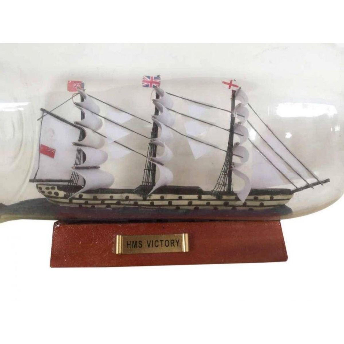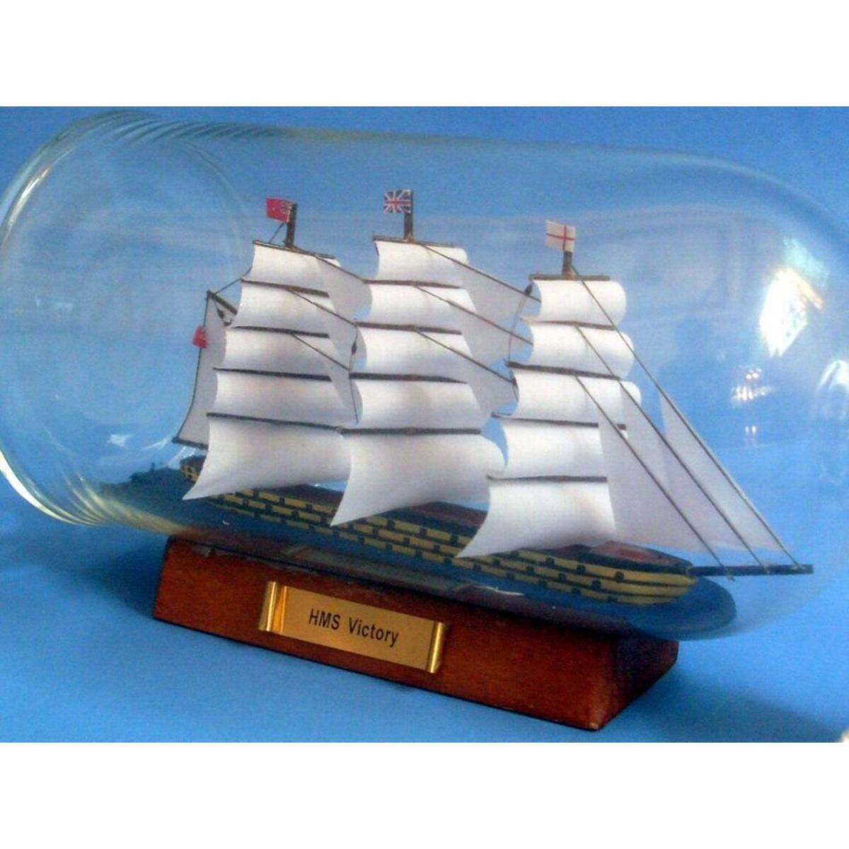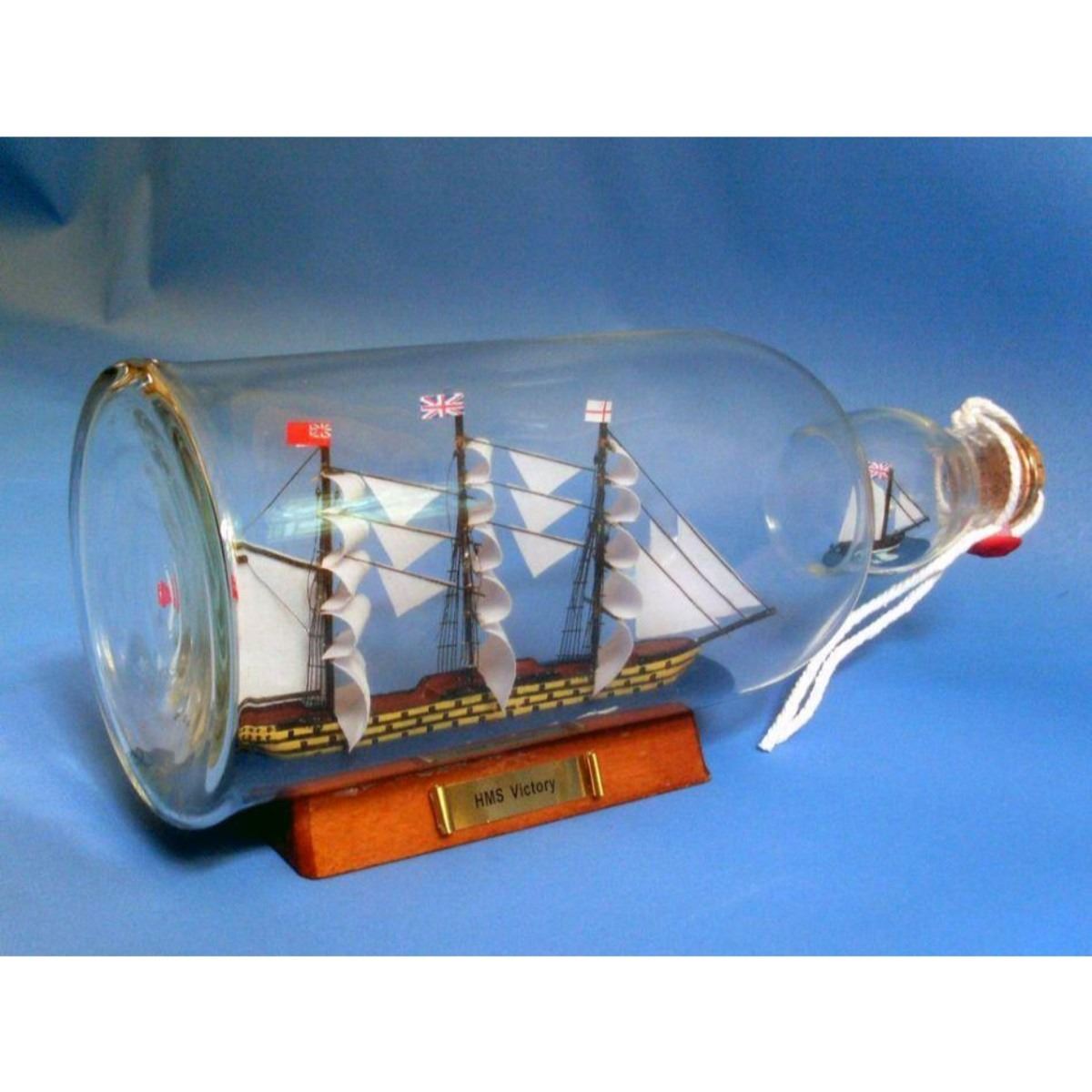 HMS Victory Model Ship in a Glass Bottle 11" FULLY ASSEMBLED – READY FOR IMMEDIATE DISPLAY This is not a Ship-in-a-Bottle kit The ship in a bottle is one of the classic items of nautical decor, as much fun and mystery as it is remarkable craftsmanship. Now you can enjoy an adorable ship in a bottle for yourself or give one as a gift to friends, family, clients or co-workers. 11†Long x 4†Wide x 5†High Arrives fully assembled with all sails mounted --- This is not a ship in a bottle kit! Real glass bottle with a classic style Handcrafted wooden hull and masts Cork stopper and melted wax with an anchor impression seal the bottle Metal nameplate on wooden base identifies the ship as the HMS Victory
