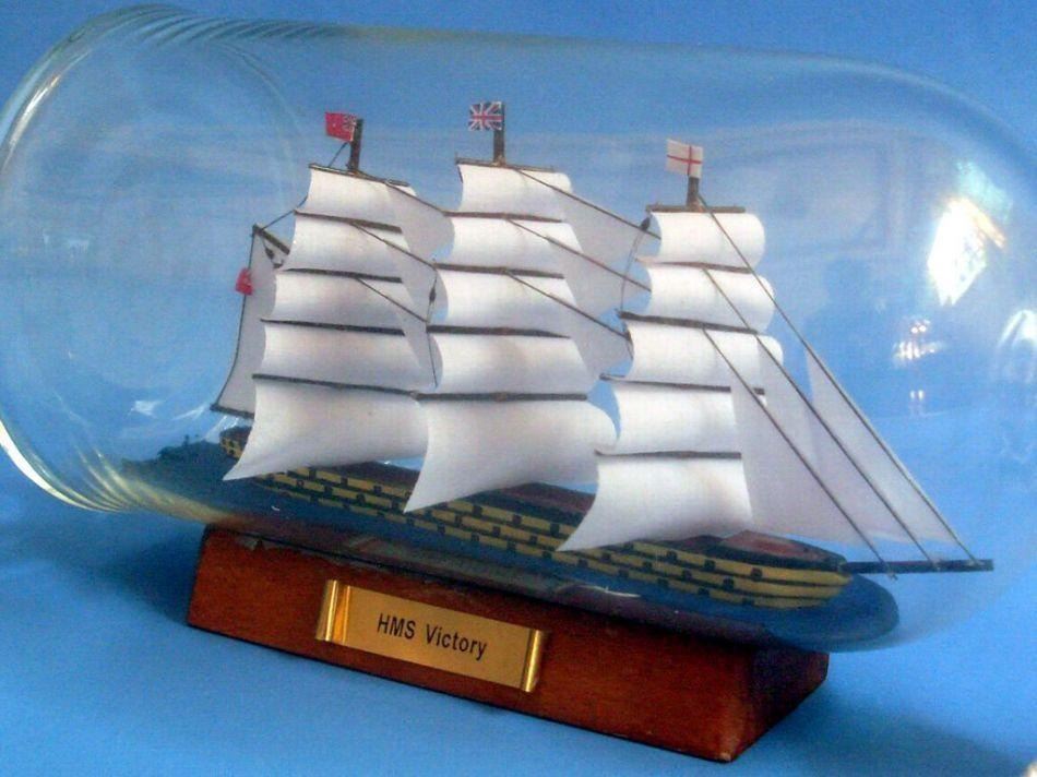 HMS Victory Model Ship in a Glass Bottle 11" FULLY ASSEMBLED – READY FOR IMMEDIATE DISPLAY This is not a Ship-in-a-Bottle kit The ship in a bottle is one of the classic items of nautical decor, as much fun and mystery as it is remarkable craftsmanship. Now you can enjoy an adorable ship in a bottle for yourself or give one as a gift to friends, family, clients or co-workers. 11†Long x 4†Wide x 5†High Arrives fully assembled with all sails mounted --- This is not a ship in a bottle kit! Real glass bottle with a classic style Handcrafted wooden hull and masts Cork stopper and melted wax with an anchor impression seal the bottle Metal nameplate on wooden base identifies the ship as the HMS Victory