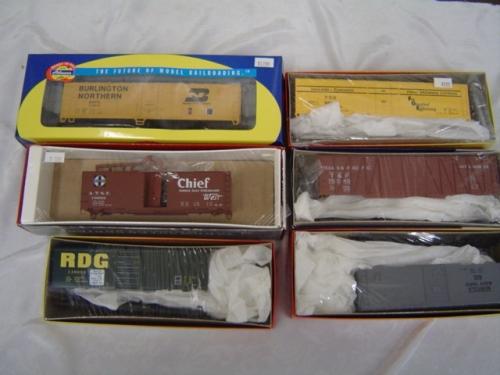 Round House # 10702 40' AAR box car reoding, # 10607 40' AAR Box Car Norfolk Navy Yard, # 2131 50 s/s auto end box steel DD (Texas & Pacific), # 12502 50 Plug Door Box Car Pennsylvania Fruit growers, Branchline # 8045 HO AAR 40' Box Car SF (ATSF Car # 137162), 8024 AAR 40 ft Box Car CP # 221934, 8019 AAD 40 ft Box Car UP 187085