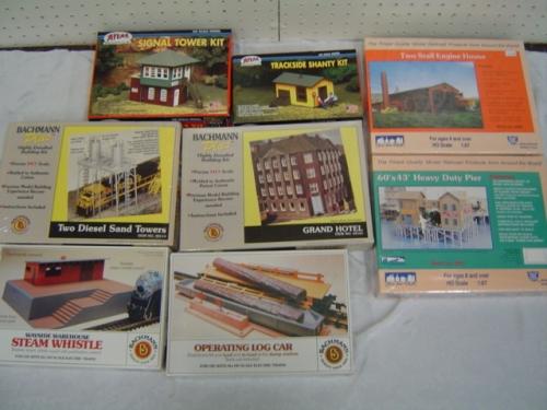 IHC # 3500 Two Stall Engine House kit, # 5501 60'x43' Heavy Duty Pier Kit, Bachmann Plus # 35121 Grand Hotel Kit, # 35114 Two Diesil Sand Towers,  Bachmann # 46209 Wayside Warehouse Steam Whistle, # 461203 Operating Log Car, Atlas # 702 Track Side Shanty 704 Signal Tower Kit,
