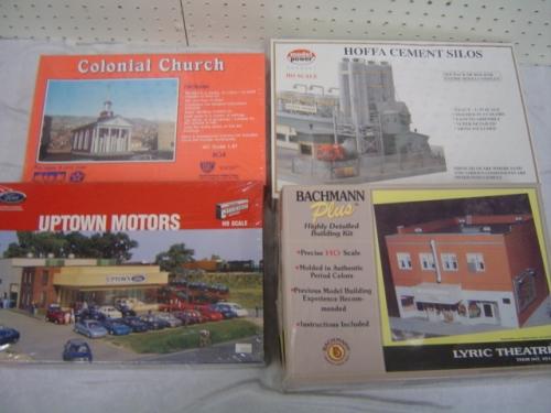 IHC # 804 Colonial Church, Model Power # 298 Hoffa Cement Silos,Walthers Conerstone 933-3077 uptown Ford Motors, 2 Bachmann # 35103 Lyric Theatre