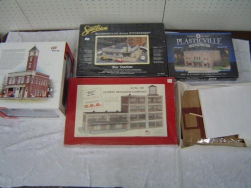 Walthers Cornerstone 933-2809 Fire Co #4 Assembly, Korber Models # 108 Global Transfer 19" long by 11 high 5 wall, # 105 One round house stall, Bachmann # 45525 Silver Series Theater, # 88005 Specgtrum series Bus Station
