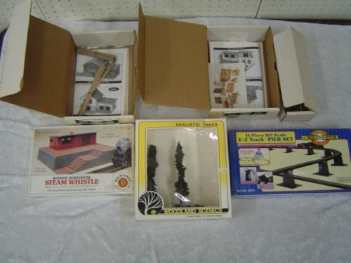 Bachmann # 44471 14 pc HO EZ Track pier set, # 46209 Wayside WarehouseSteam Whistle, Woodland # TR1063 Pines 7"&8" Conifer, A.W.Enterprises # 4201 GN 34' Woodside Coal, 2 Mainline and siding MS014 Sign Kit, Preweathered North East Lumber Construction withnatural aged barnwood finish for board by boaard assembly