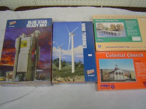 Walthers Conerstone 933-3086 Blue Star Ready Mix, 933-3163 Wind Turbines (2), IHC 5505 90x42 Transfer Tier, # 804 Colonial Church