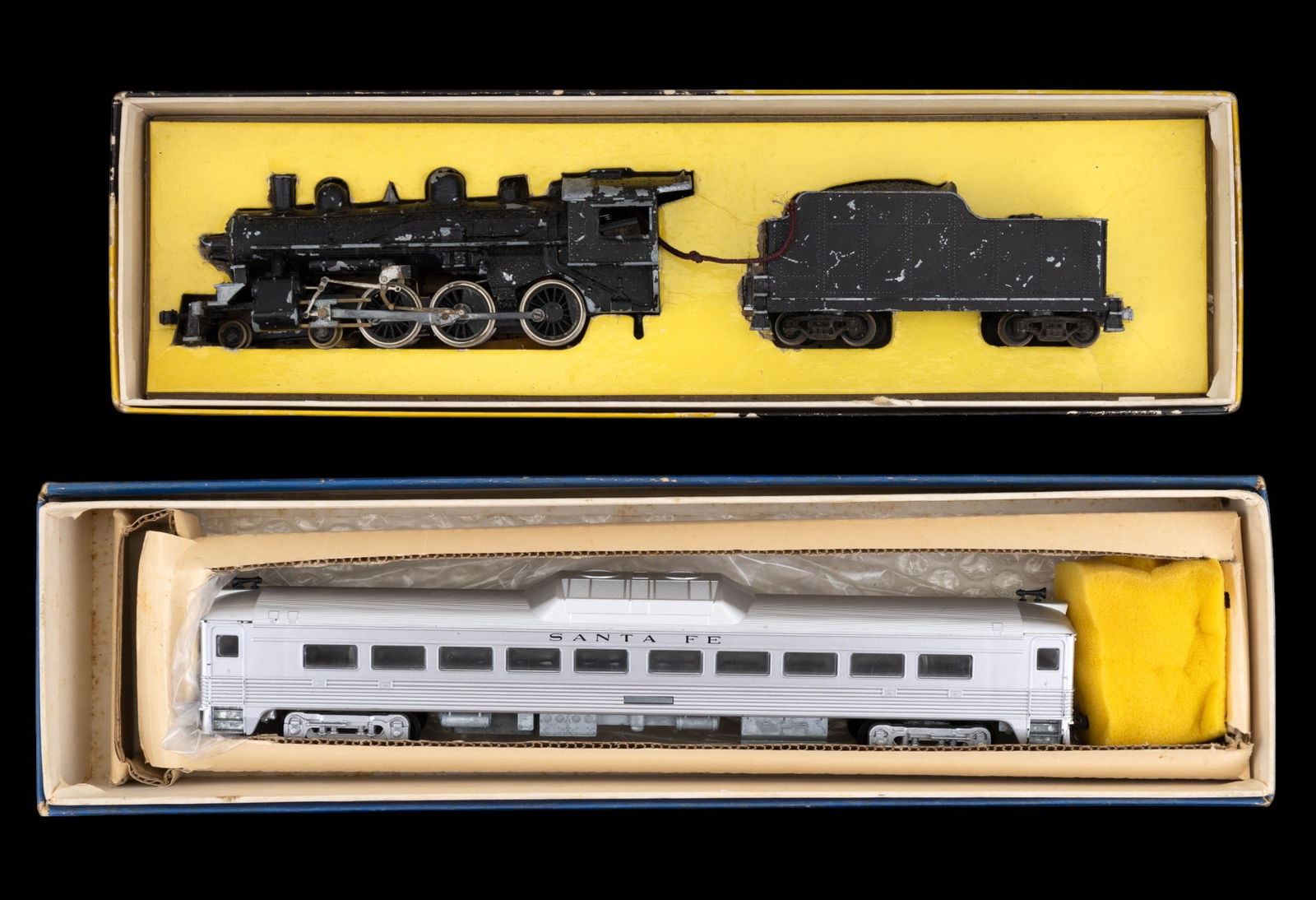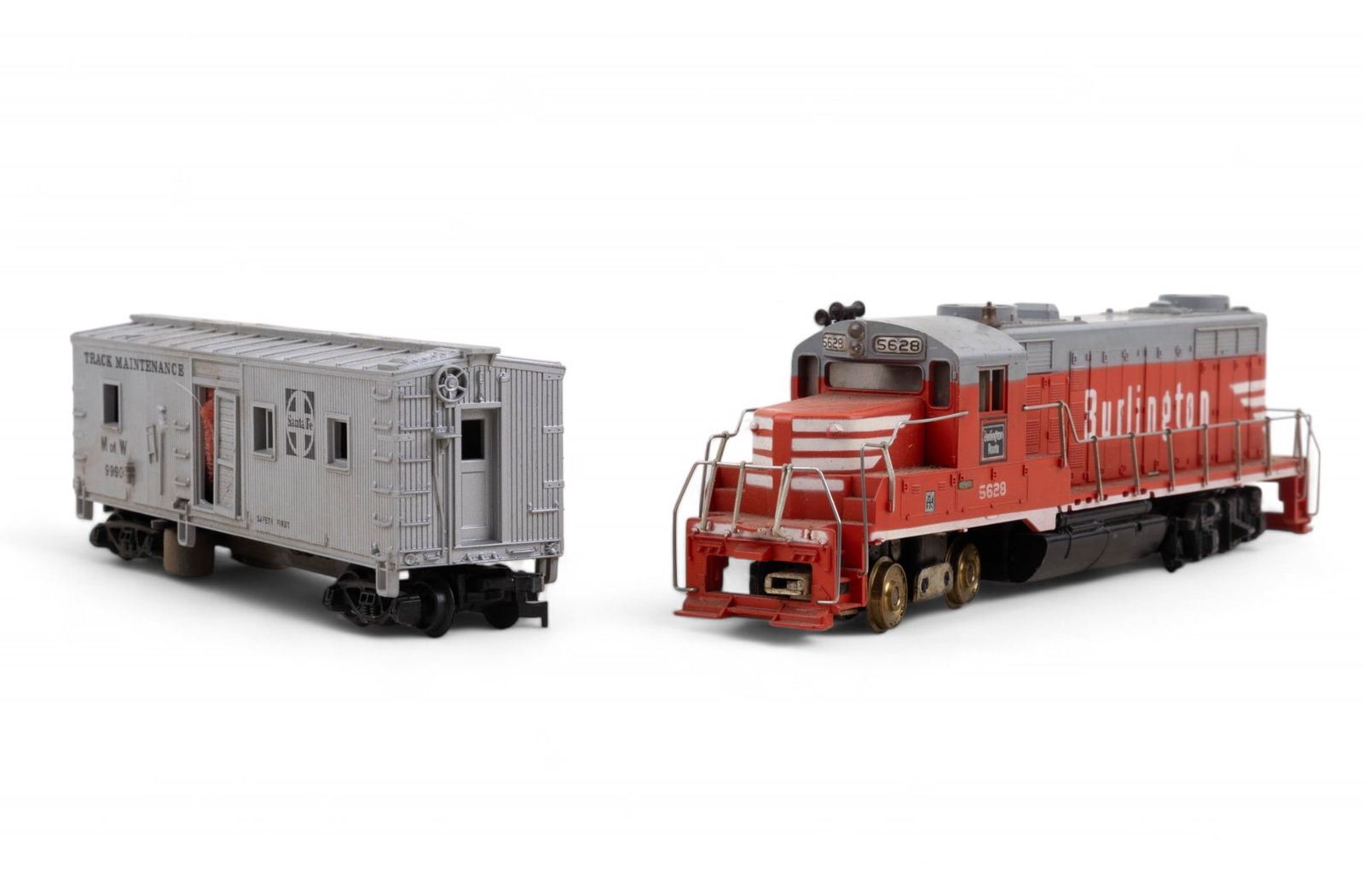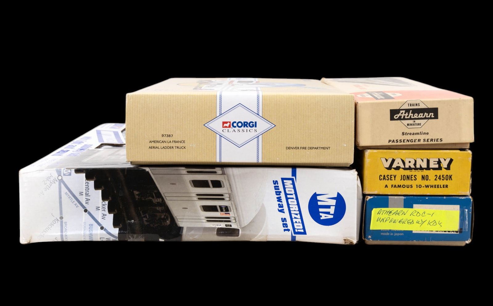 Features a Varney brand "Casey Jones" engine and tender in original box with wear and loss consistent with age. 2 Athearn brand Sante Fe passenger cars - 1 in original box and 1 in Balboa box. 4 Penn Line passenger cars - for parts. 1 Burlington diesel engine with wer and loss. 2 Santa Fe "Track Maintenance" box cars. 1 Daron brand MTA NY motorized Subway set NIP (not HO scale). 1 Corgi Classics "Denver Fire Department" truck NIB.2 paper unassembled paper model kits re also included.