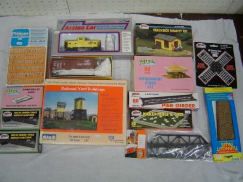 Midwest # 3023 cork left Hand turn out pads (2), IHC # 4358 Action car (track cleaning ) Chicago & North Western, Roundhouse (MDC) # 10609 40' AAR Box car C& EL, ConCor # 0002-009031 Stone Creek bridge, Prieser HO # 16343 130 Unpainter figures, IHC # 3501Rail road yard kit, Atlas 82 4 sections Pier girder,Atlas 176 Ho 90 degree crossing, 715 Refreshment Stand Kit, 702 Trackside Shanty kit,2- 65 HO/N undertable Switch Machine, 200 Snap relay, 776 Pickett fence & gate 72 "