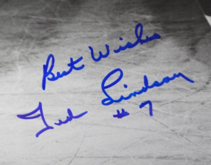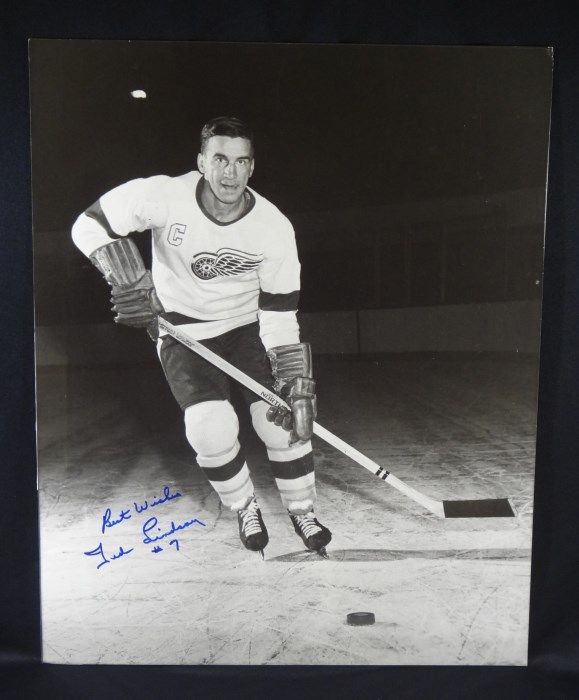 Signed by Ted Lindsay in blue sharpie "Best Wishes Ted Lindsay #7". Est. Value $85.00 - $95.00.