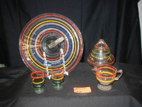 HOCKING BANDED RINGS CTR. HANDLE PLATE 11 3/4in, FTD. CREAMER, (2) JUICE GLASSES 3in, SCONCE, 5 PC