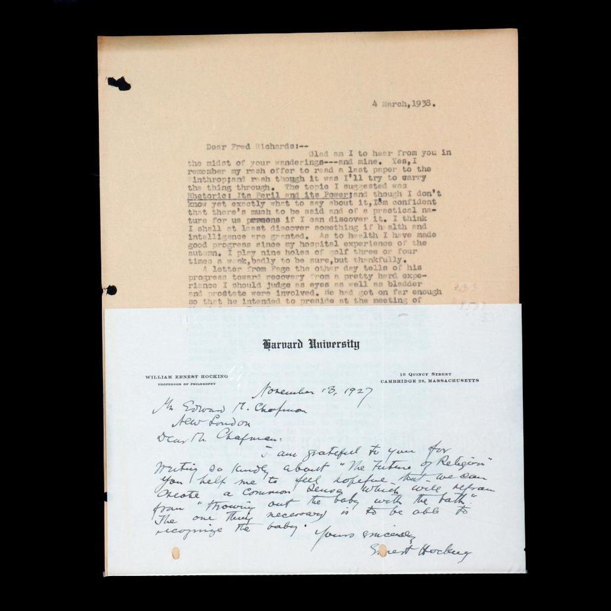 A letter from Professor William Ernest Hocking to Edward M. Chapman, and a typed carbon copy of a letter from Chapman to another Harvard-associated acquaintance: 1. HOCKING: Single-sheet ALS on Harvard University letterhead, to Edward M. Chapman, November 13, 1927. He thanks Chapman for a favorable review: "You help me to feel hopeful that we can create a common sense which will refrain from 'throwing out the baby with the bathwater.'" 5 1/2in. x 8 1/2in. Condition: Two vertical folds, hole punches, toning. 2. CHAPMAN: A typed carbon copy of a letter to another colleague, Fred Richards, March 4, 1938. With tidbits of academic news/gossip, his and others' health updates, etc.: "A letter from Page the other day tells of his progress toward recovery... He had got on far enough so that he intended to preside at the meeting of the Andover Trustees..."; and mentions Lucius Baird, Peabody, Blakeley, and others. 11in. x 8in. Condition: Very toned, hole punches. PLEASE NOTE: 20TH CENTURY DOCUMENTS CAN HAVE VARIED TONING FROM AGE; IMAGES MAY APPEAR LIGHTER ON DIFFERENT SCREENS. EDWARD MORTIMER CHAPMAN (1862-1952) was a Connecticut pastor, academic, and author. He graduated from Yale Divinity School in 1890. Chapman was a descendant of Robert Chapman, one of the first settlers of Saybrook, Connecticut (c. 1635). He served as pastor of Old Lyme Church from 1906 to 1915. Chapman€™s works integrated his wide-ranging theological, literary, and historical interests. This lot and the other Chapman-related documents offered in this sale were part of a collection of his family papers.