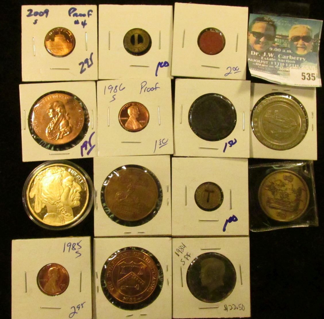 HODGEPODGE COIN LOT INCLUDES COCA COLA TOKEN, TRANSIT TOKENS, RED POINT OPA RATION TOKEN, REPLICA GOLD BUFFALO, DENVER MINT MEDAL, 1984-S PROOF KENNEDY HALF DOLLAR, CASINO AZTAR GAMING TOKEN, JAMES MADISON MEDAL, PHILADELPHIA MINT MEDAL, KENYUCKY DERBY MEDAL, AND SOME PROOF LINCOLN CENTS