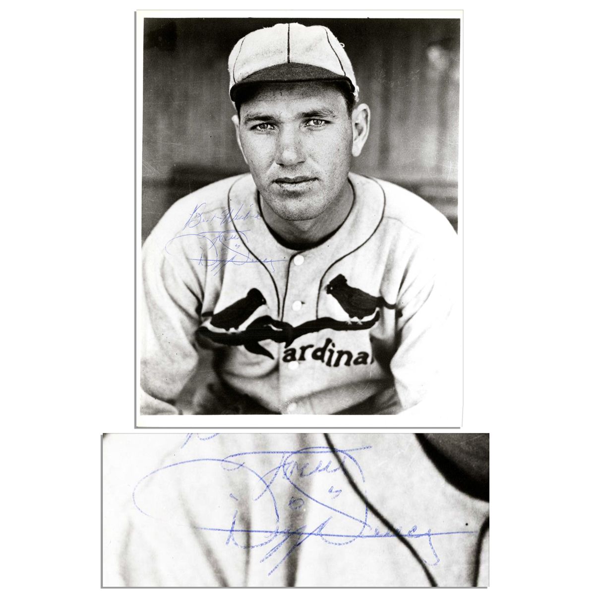 Dizzy Dean signed photo. The HOF baseball player-turned sports commentator inscribes his Cardinals uniform in blue ink, ''Best Wishes / From / Dizzy Dean''. Glossy photo measures 8'' x 10''. Fine.