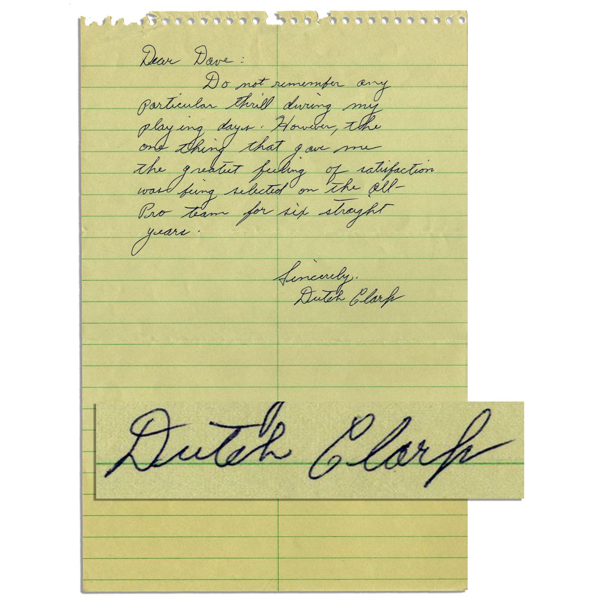Pro Football Hall of Fame inductee Earl ''Dutch'' Clark autograph letter signed. Clark writes to a fan, ''Dear Dave: Do not remember any particular thrill during my playing days. However, the one thing that gave me the greatest feeling of satisfaction was being selected on the all-pro team for six straight years. Sincerely, Dutch Clark''. Dutch played for the Detroit Lions and the Portsmouth Spartans during the 1930's. Page measures 6'' x 9''. Top edge torn from a spiral notebook, otherwise near fine condition. ith PSA/DNA COA.