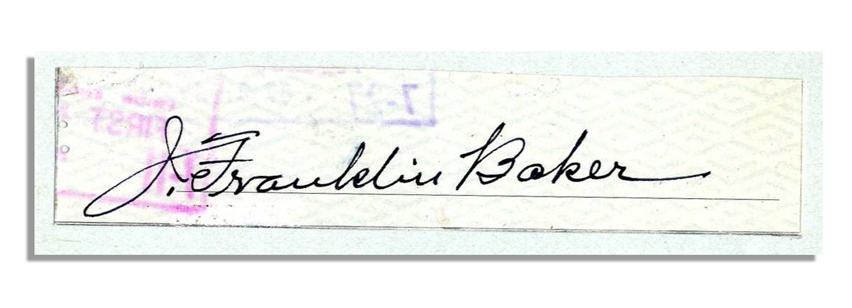 HOFer Frank ''Home Run'' Baker Signature -- Signed ''J. Franklin Baker'' Clipped From Check -- 5'' x 3'' -- With JSA COA