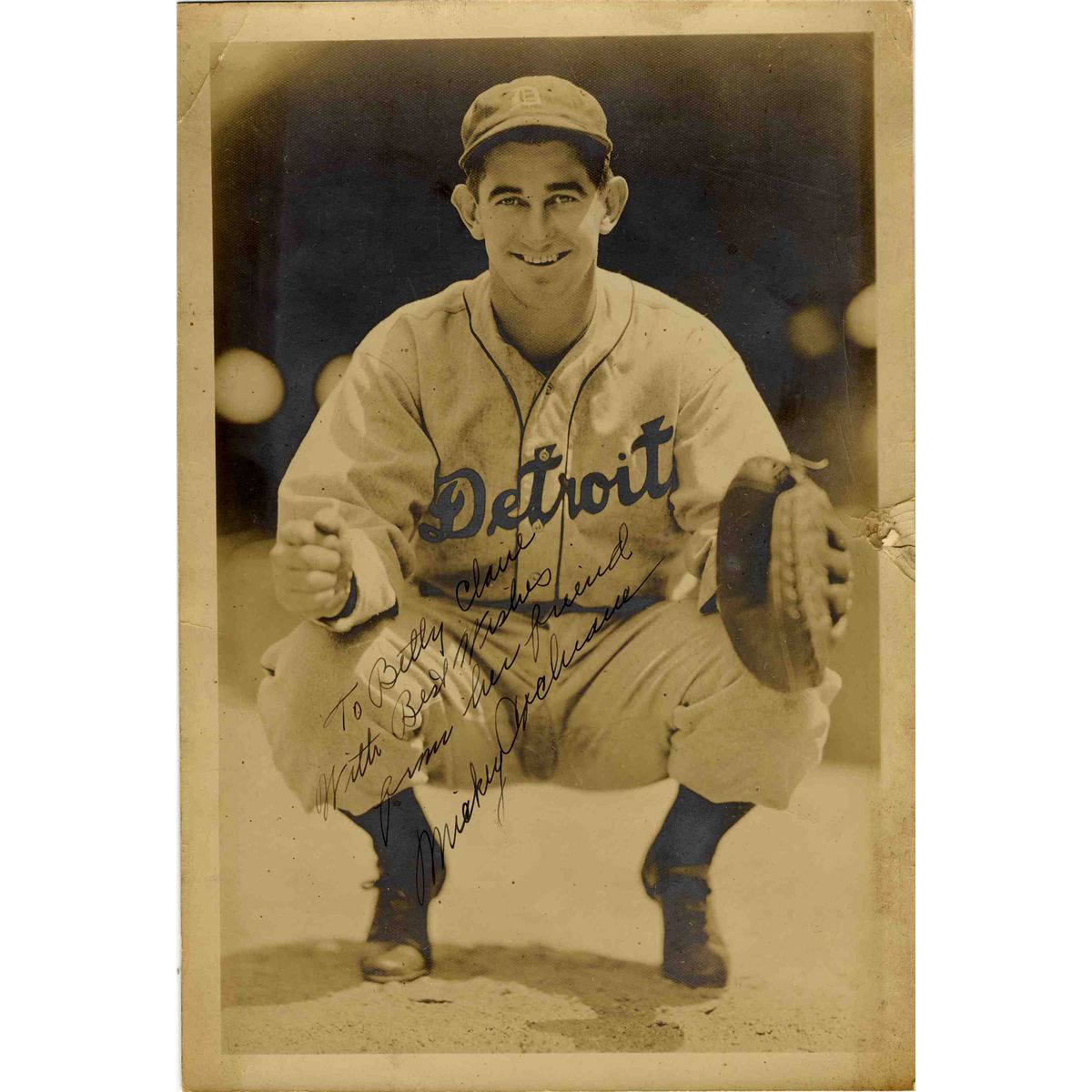 Signed photo of baseball Hall of Famer Mickey Cochrane who batted .320 during his 13-year career. Matte photo measures 6.25'' x 9.25''. Signed and inscribed in black ink, ''To Betty Claire, with best wishes from her friend, Mickey Cochrane.'' In very good condition, with scattered silvering, tear to right edge, and scattered creasing and soiling. Cochrane is quite uncommon in photos of this size.