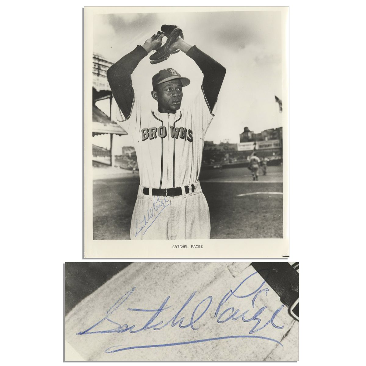 Photo signed, ''Satchel Paige'' by the first Negro League player inducted into the Baseball Hall of Fame. Photo of the pitcher is signed in blue ink across his right hip on the left side of the photo. Glossy photo measures 8'' x 10''. Minor surface creasing. Near fine.