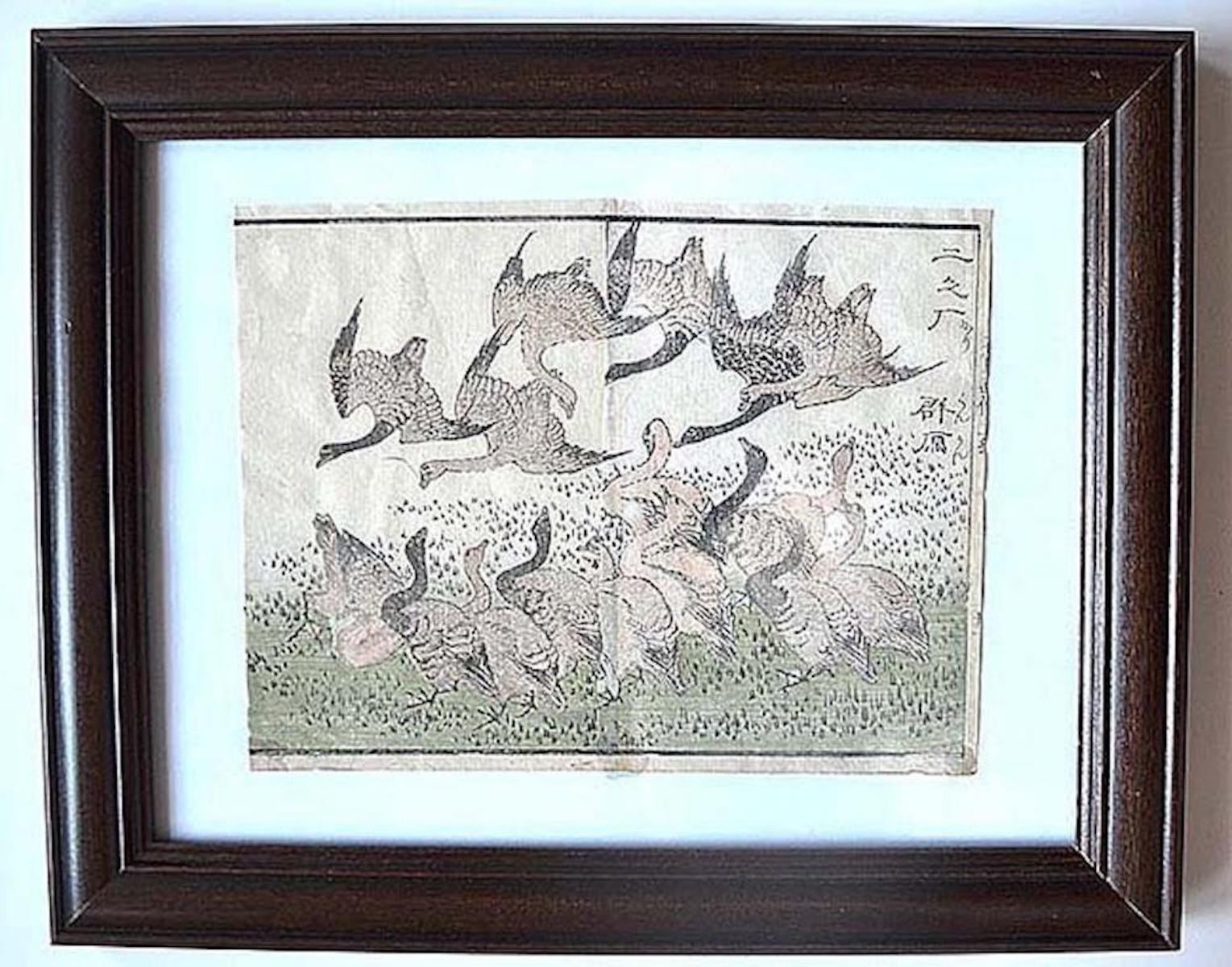 HOKUSAI "GEES LANDING" WOODBLOCK PRINT. FRAMED WOODBLOCK PRINT.Japanese Woodblock Print Book Kwacha Garden. By Katsushika Taito, (Hokusai) 1848THESE ARE ORIGINAL JAPANESE WOODBLOCK PRINT BY HOKUSAIL FROM HIS BOOK MENTIONED ABOVE. THEY WERE PRINTED IN 1848. THE IMAGES CONTAINS TWO PAGES PUT TOGETHER TO FORMED ONE IMAGE. THE APROXIMATE SIZE OF THE IMAGE IS 8.5 X 6. THEY ARE IN A FRAMED THAT MEASURES APROXIMATELY 10 X 13. THESE FRAMES CAN BE MOUNTED ON A WALL OR SIT ON A TABLE.THESE MAKE A PERFECT INEXPENSIVE HOLIDAY PRESENT FOR A JAPANESE WOODBLOCK PRINT.PLEASE NOTE THAT SHIPPING WILL BE $25 FOR A USPS PRIORITY MAIL INSURED.