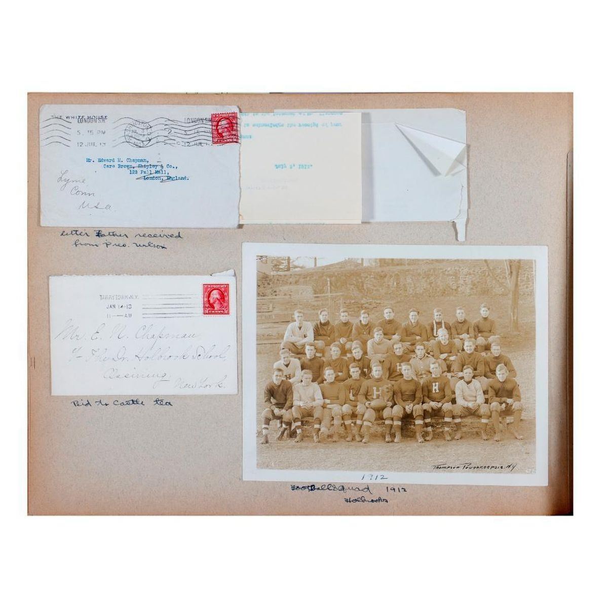 CHAPMAN, EDWARD NORTHROP (1895-1978). A scrapbook of Chapman's time at Dr. Holbrook's Military and Boarding School in Ossining, New York (active 1864-1915), with material from 1912 to 1913. Edward N. was the son of Edward Mortimer Chapman (1862-1952), and Isabel Northrop Chapman (1894-1920), and a descendent of original settlers of Saybrook, Connecticut. He graduated from Yale University in 1917. The scrapbook has the school armorial stamped on the cover, and is comprised of approx. 15 leaves of entries and material, including a Woodrow Wilson secretarial letter/envelope addressed to his father Edward M. Chapman (see below), and approx. 93 glued in photographs. Most of the photographs have written captions and show a dorm room and exteriors of the school, including photos of Mrs. Harry Holbrook and Carol Holbrook; many schoolmates on the school grounds, on ferries, at a train station, in New York City and elsewhere; running and other sports competitions, picnics, etc.; and one photo of Sing Sing Prison. There are three pages of classmate signatures, and approx. 50+ ephemera items, including school events, dinners, and sports programs; local theater flyers/programs and ticket stubs; school-related newspaper clippings; several notices of Yale University exams passed and not passed; and invitations and dance cards. 12 1/2in. x 17in. Condition: Cover is loosened, scratched, corners worn; pages are toned but ephemera is mostly in good condition (though partially or wholly glued in). [WILSON, WOODROW, 1856-1924]. Single-sheet TLS to Edward M. Chapman, from Secretary to the President, Joseph Patrick Tumulty (1879-1954), White House letterhead and envelope. The stamped/franked envelope is addressed to Edward M. Chapman's London bank/contact, Brown, Shipley & Co., and forwarded to Lyme. The letter concerns Edward M.'s Lyme, Connecticut Postmaster lobbying effort on behalf of Clarence Clark. 9 1/4in. x 5 5/8in. Condition: Two horizontal folds and other light creases; one small corner tear; toning; the envelope is tipped onto a page in the scrapbook. PLEASE NOTE: 20TH CENTURY DOCUMENTS CAN HAVE VARIED TONING FROM AGE; IMAGES MAY APPEAR LIGHTER ON DIFFERENT SCREENS. EDWARD MORTIMER CHAPMAN (1862-1952) was a Connecticut pastor, academic, and author. He graduated from Yale Divinity School in 1890. He served as pastor of Old Lyme Church from 1906 to 1915. Chapman had a personal acquaintance with Woodrow Wilson, both before and during his U.S. presidency, through the church and time spent in Lyme, Connecticut. This lot and the other Chapman-related items offered in this sale were part of a collection of his family papers/ephemera.
