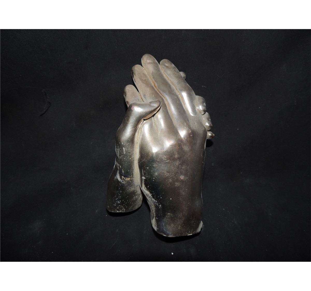 HOLDING HANDS CHROMED ART SCULPTURE. FEMALE HOLDING A MALE HAND.