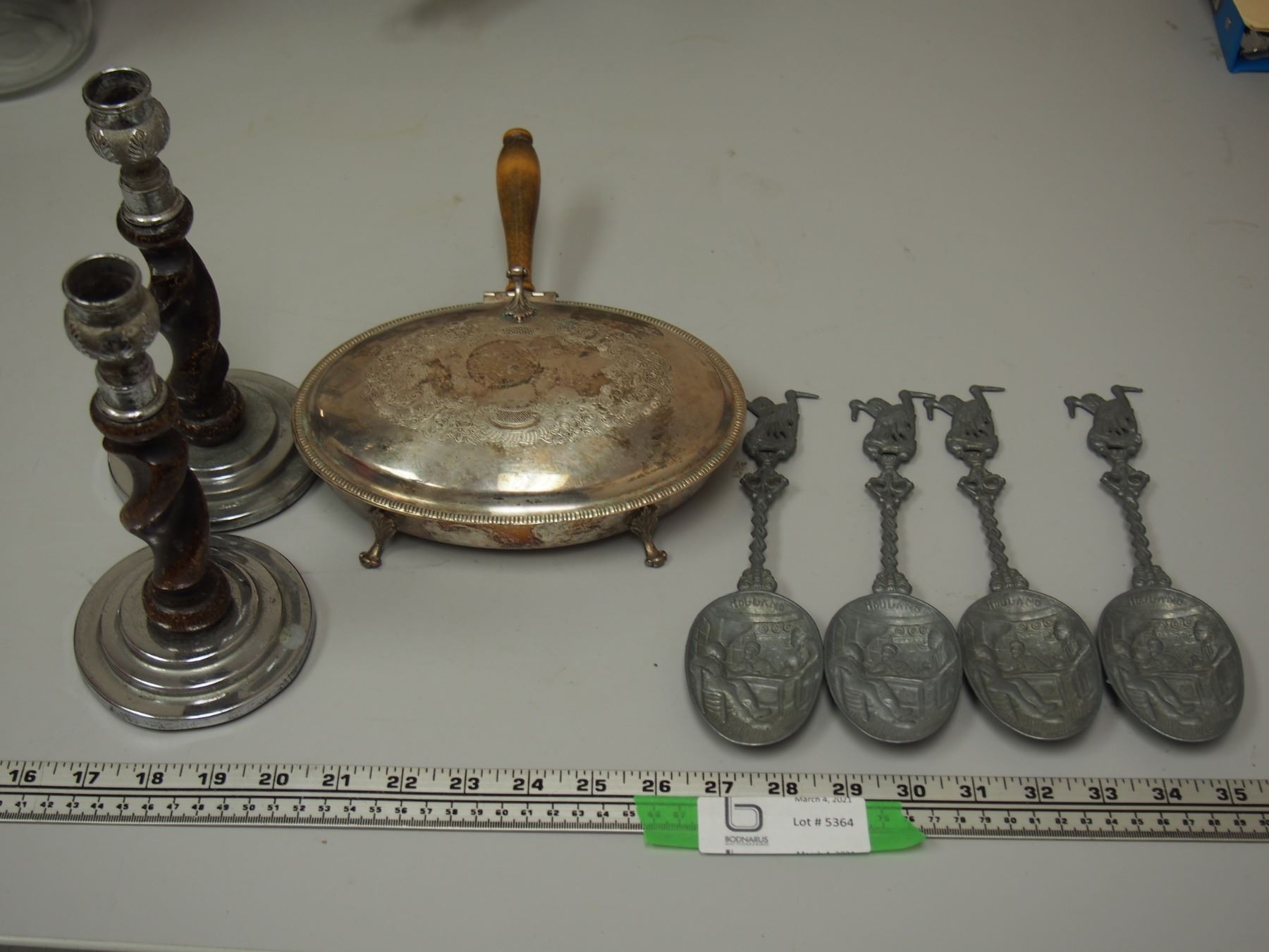 HOLLARD COLLECTOR SPOONS, VINTAGE CANDLE STICKS PLUS MISC