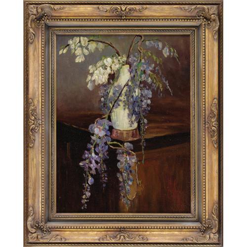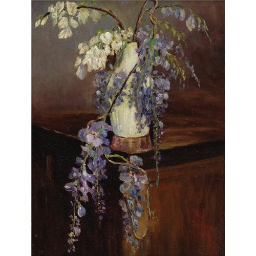 <B>MINNIE HOLLIS HOLTOM (1888-1978)</B></I><BR><I>Wisteria</B></I><BR>Oil on canvasboard<BR>15 1/2in. x 11 1/2in.<BR>Signed lower right<BR><BR>Minne Hollis Haltom studied under some of Texas' most notable artists; Eloise Polk McGill, Rolla Taylor, Robert Jenkins Onderdonk, Julian Onderdonk, Jose Arpa, and Xavier Gonzalez. She was known for her still life and wildflower paintings. This is an excellent example of one of her still lifes.<BR><BR>The verso of the painting contains notes on art and color in the artist's hand.<BR><BR> <B>Condition Report:</B> Excellent condition with minor impainting. New painting in excellent condition.<BR><BR><BR><b>Shipping:</b> Requires 3rd Party Shipping (<a target="_blank" href="http://www.heritageauctions.com/common/shipping.php">view shipping information</a>)