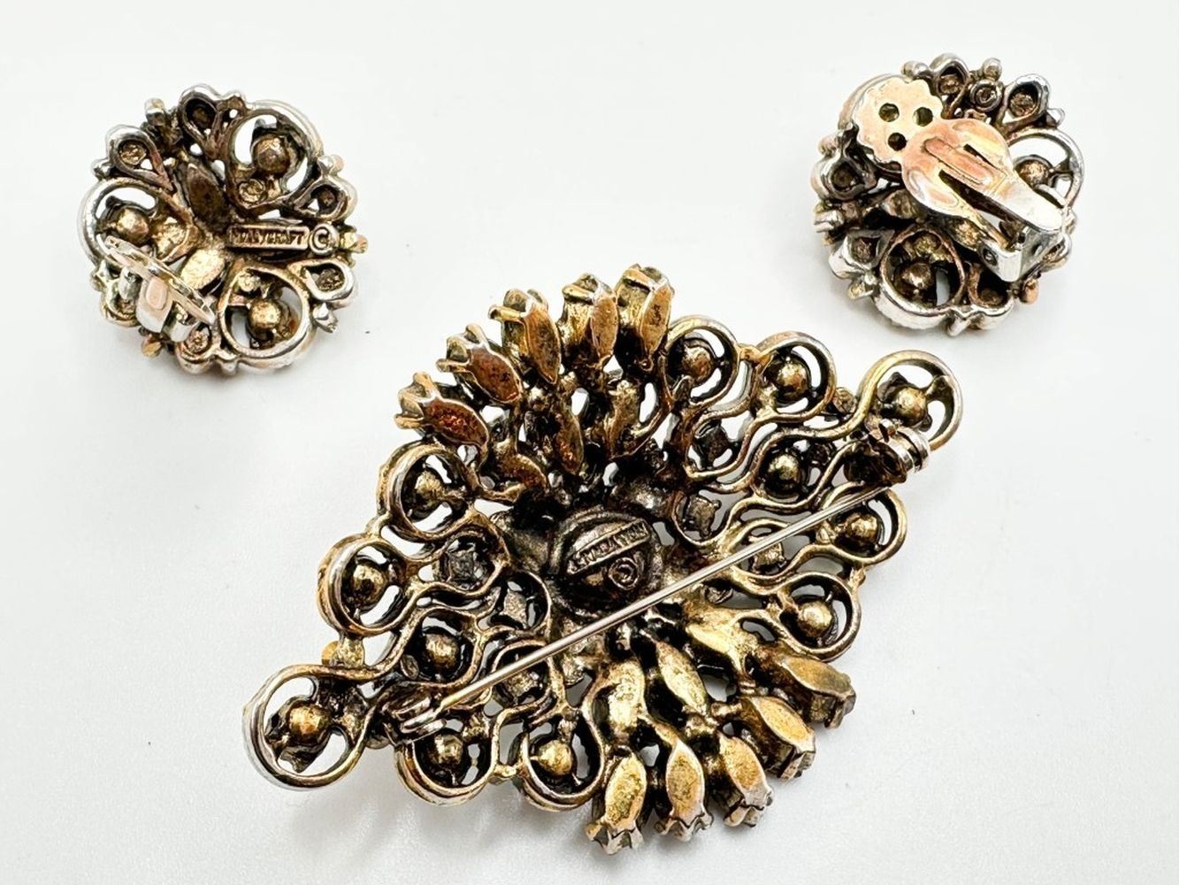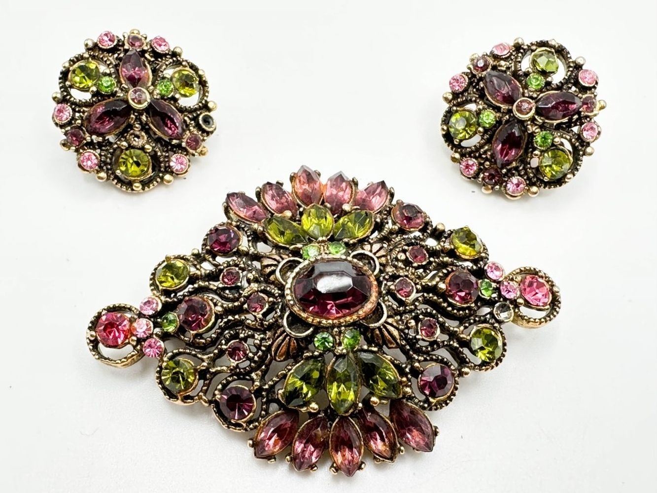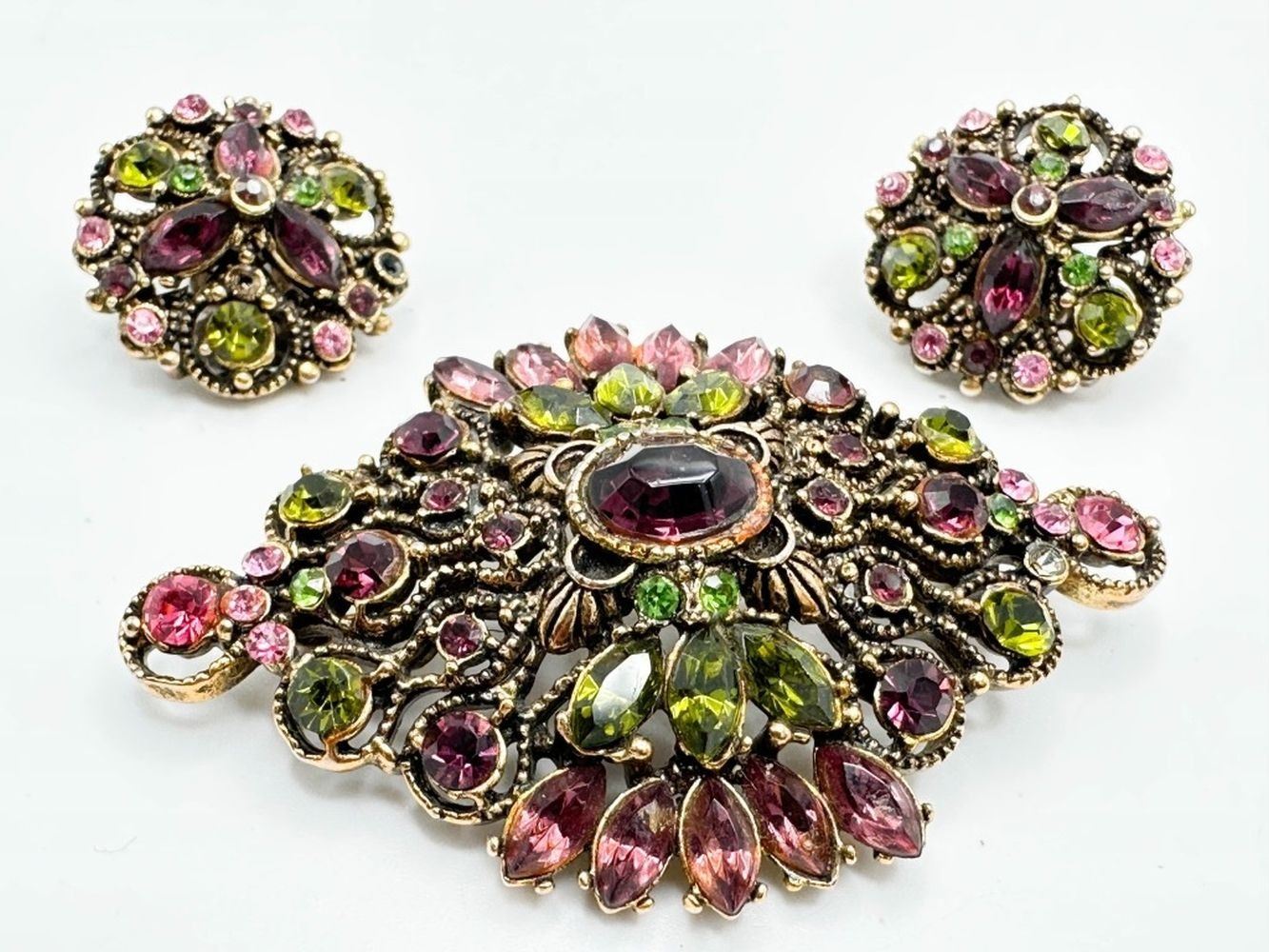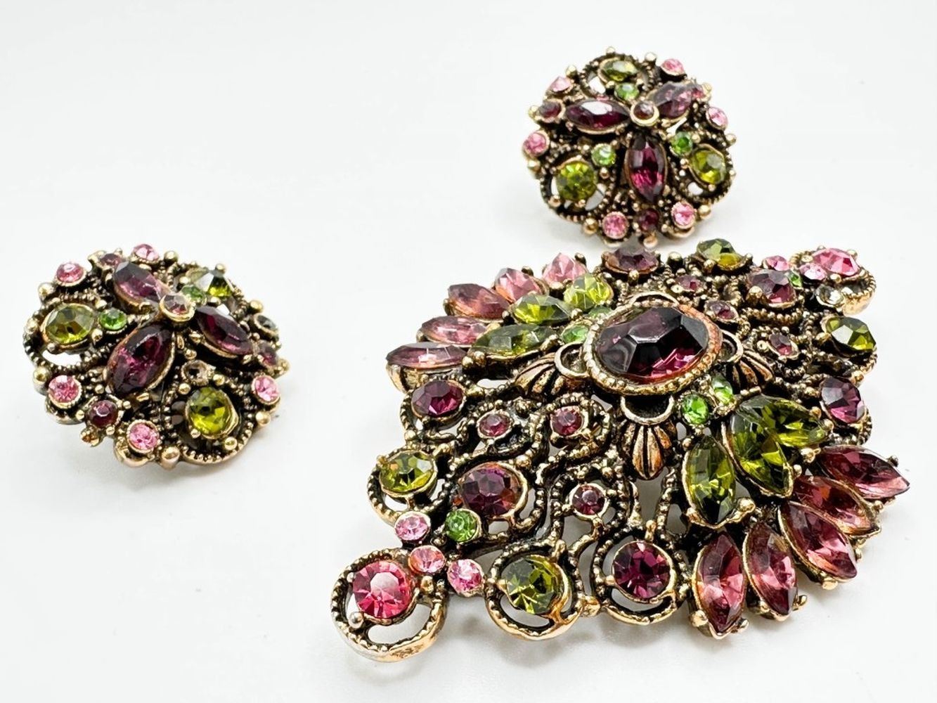 HOLLYCRAFT SIGNED MATCHING BROOCH AND EARRINGS COLOR STONE SET, SIGNED HOLLYCRAFT