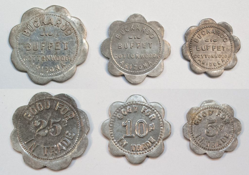 (3) set of BUCKAROO BUFFET // 5¢ & 10¢ & 25¢ Scalloped Aluminum. Buckaroo Buffet was originally called the Purple Sage - but production of a Hollywood movie in the area changed the name to make John Wayne Western.