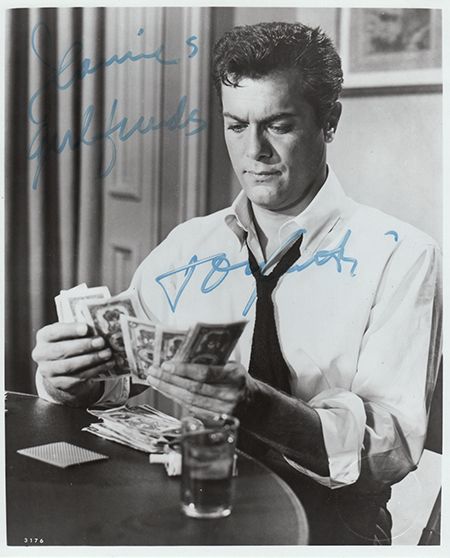 Small group of signed photos, most 4" x 5", all b/w, includes FREDERICO FELLINI (light), ALAN LADD, TIPPI HENDREN and TONY CURTIS, (8" x 10"). Fine.
