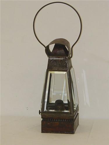 HOLMES, BOOTH & HAYDEN'S LANTERN (WATEBURY CT)-PIERCED TIN & CANTED BEVELED GLASS, BURNER & BAIL HANDLE (11 1/4" T X 4" W) - WEAR, OXIDATION & IMPERFECTIONS;