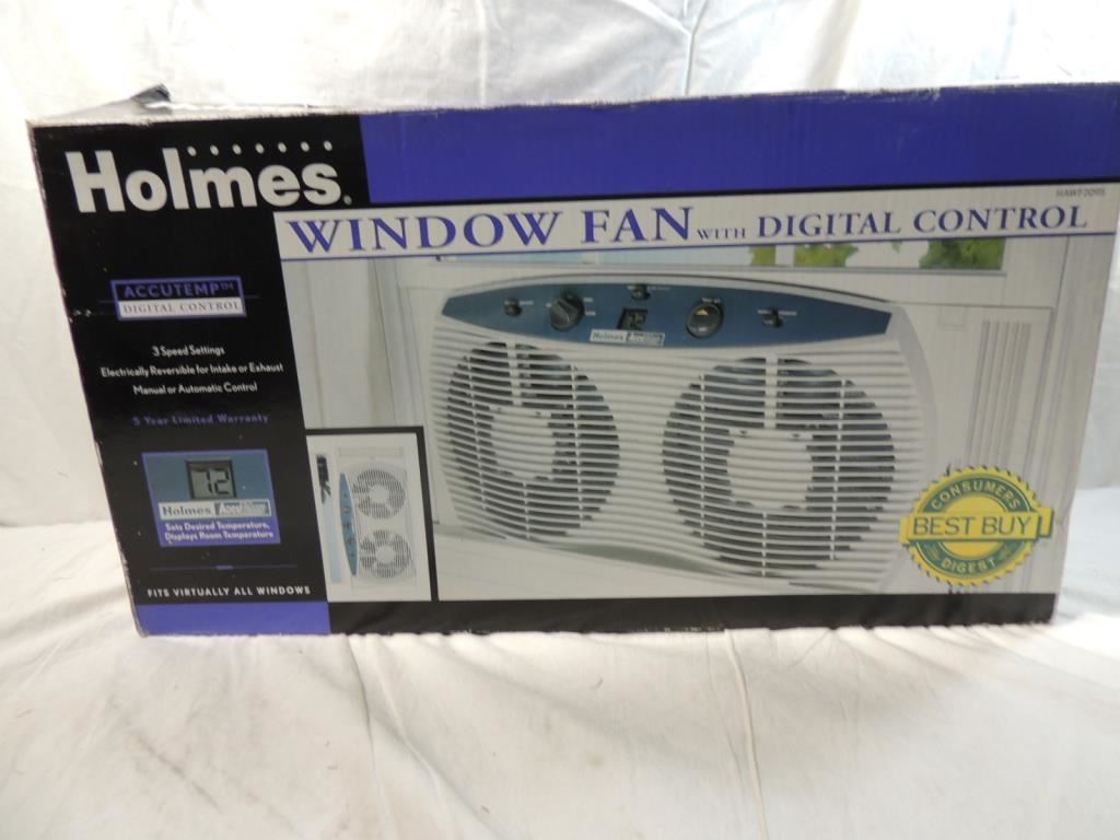 HOLMES ACCUTEMP DIGITAL CONTROL 3 SPEED SETTINGS ELECTRICALLY REVERSIVLE FOR INTAKE OR EXHAUST MANUAL OR AUTOMATIC CONTROL WINDOW FAN AS SHOWN SEE PHOTO FOR MORE DETIALS.