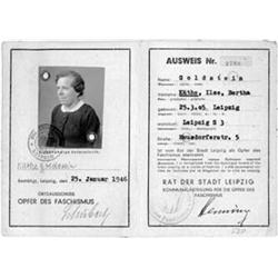 A scarce grouping of four documents issued to a Czech Jew, Kathe Goldstein. Included is Goldstein's work pass bearing "GHETTO THERESIENSTADT" at top, showing that she had undertaken forced labor from October, 1943 until the war's end. Her health record for the same period is also included, as well as an identity card issued by the Czechloslovak Repatriation Office on June 8, 1945 allowing her to return to her home, and finally a "Victim of Fascism"identity card issued by occupying forces, given to her at Liepzig on January 25, 1946. Such complete sets are rarely encountered. Very good condition,