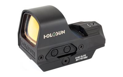 The HE510C-GR Elite is Holosun's flagship Open Reflex optic. Now equipped with Holosun's highly efficient green reticle, the HE510C-GR Elite has an open frame for a wide sight picture. The HS510C Elite is powered by our new, "Advanced Super Solar Technology" as well as, a CR2032 battery. Utilizing our multi-reticle system (MRS) this unit features three reticle choices. The HE510C-GR can be switched between a 65 MOA circle with 2 MOA dot, a 2 MOA dot only, or a 65 MOA ring only, all at the push of a button. This optic is protected by a titanium-alloyed hood.