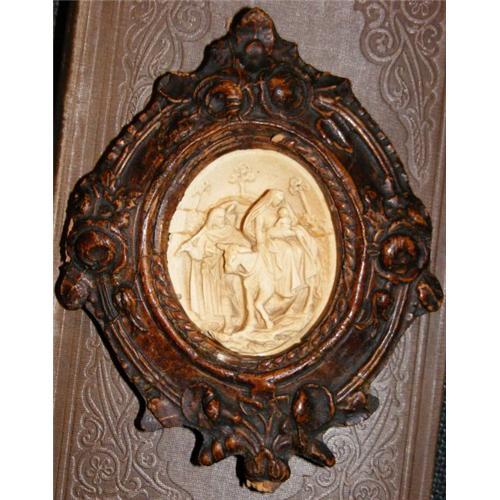Here is a wonderful Breton style carved frame (some repair) with the center piece made of Meerschaum or clay pipe, though it feels like soapstone to the touch. There has been some damage a long long time ago and I would presume there would have been a convex glass cover. There is still no visible damage from the front and it is a wonderfully ambient piece with a perfect Holy Family depiction of them 'On the Road to Nazareth'. It comes from France c1800. A beautiful French antique.