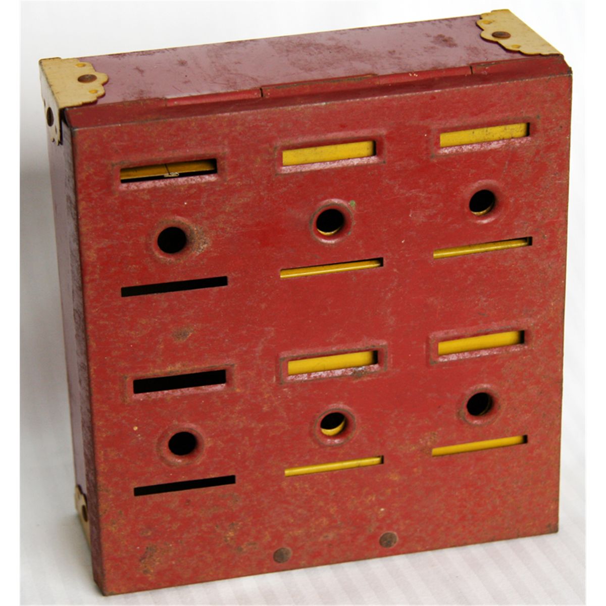 HOME BUDGET BANK. Rectangular shape. 15cm x 15cm x 5cm in height. Red metal. Six slots on top. VG.