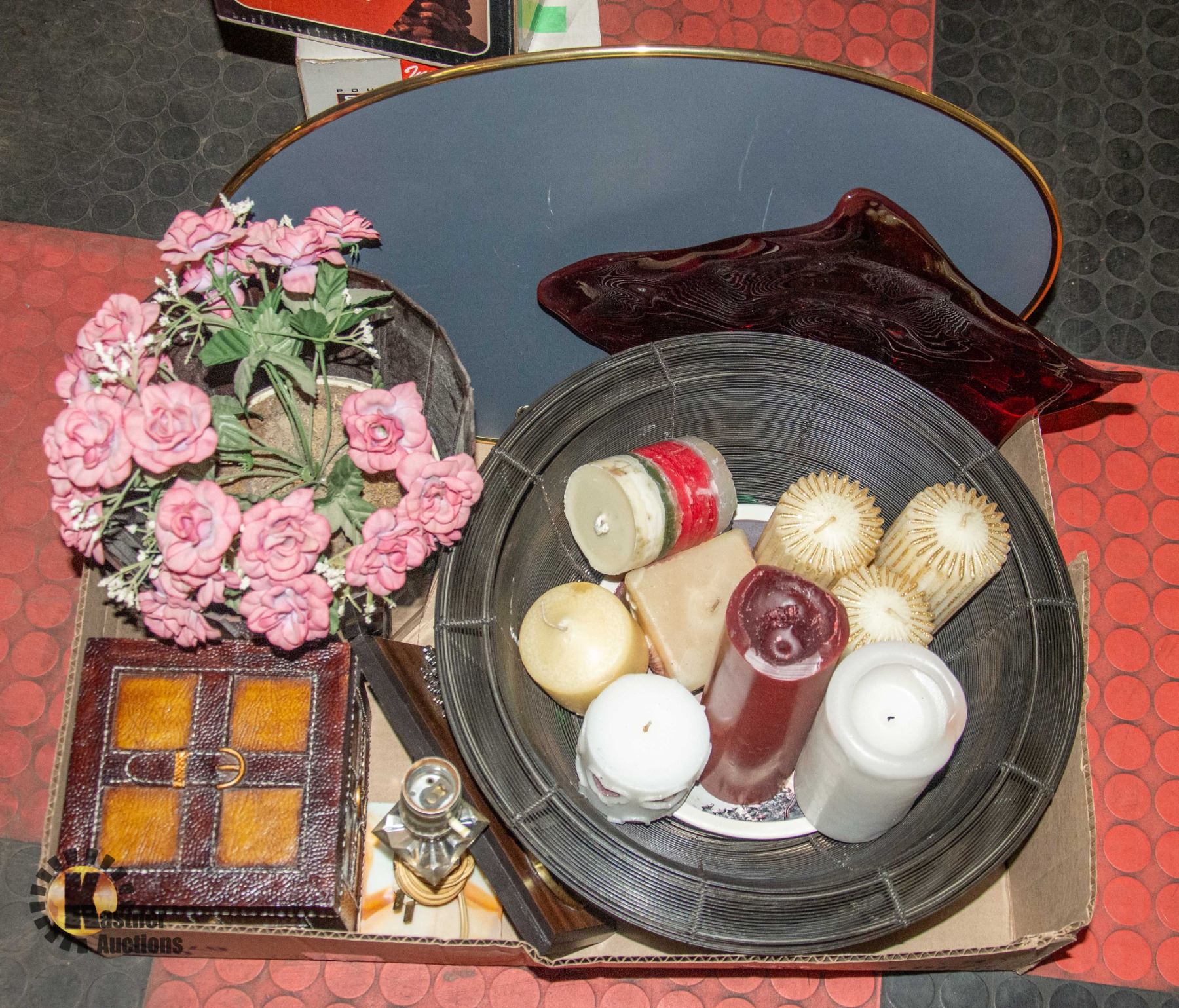 HOME DECOR CANDLES, WIRE FRUIT BASKET, LAMP ,